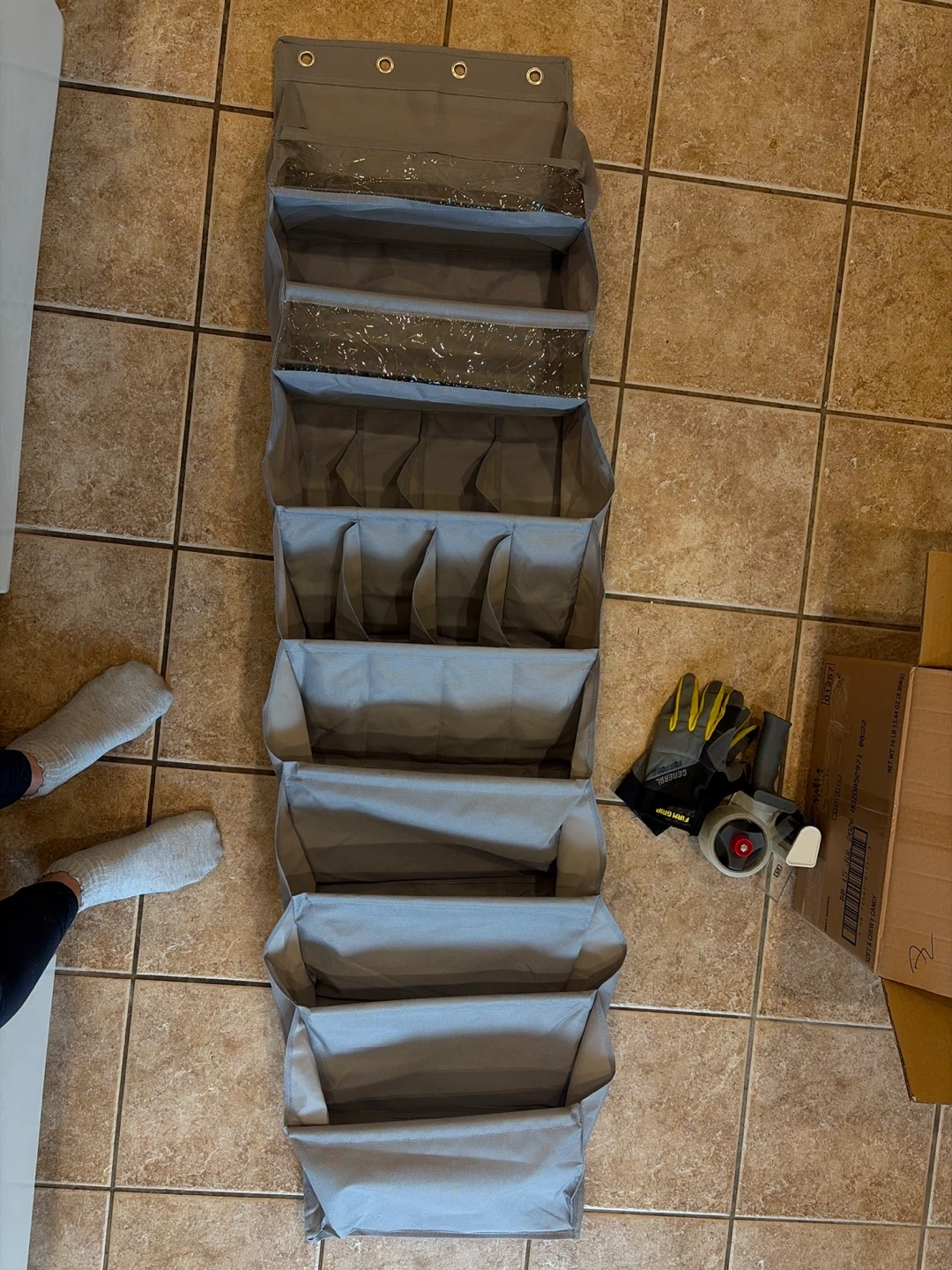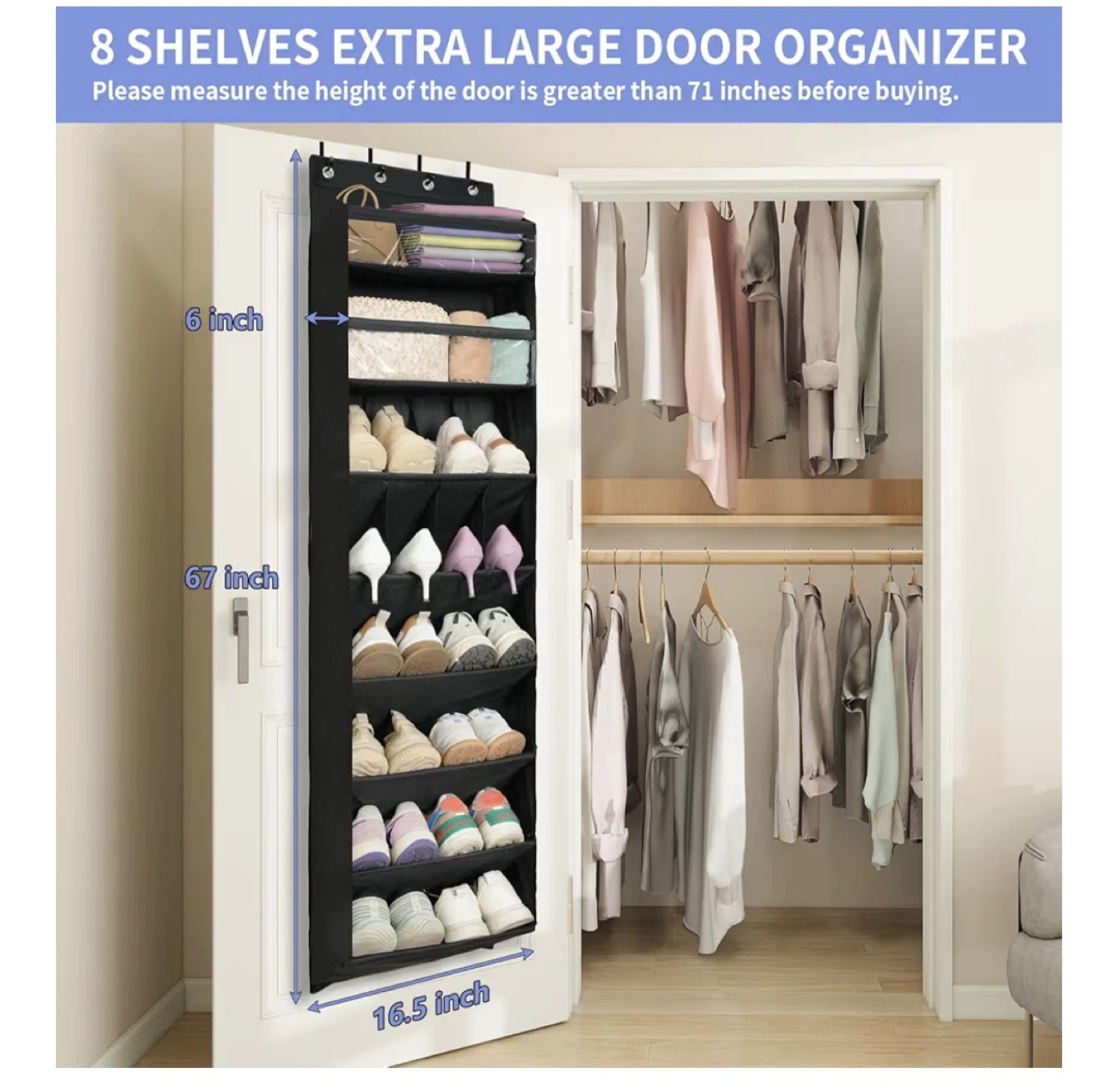 Hanging door organizer with space for shoes, etc. Very multipurpose, flat bottoms on the shelves help support any items.