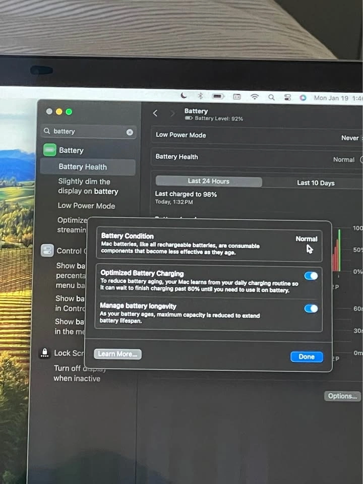 • Battery: Condition is "Normal" in system settings.