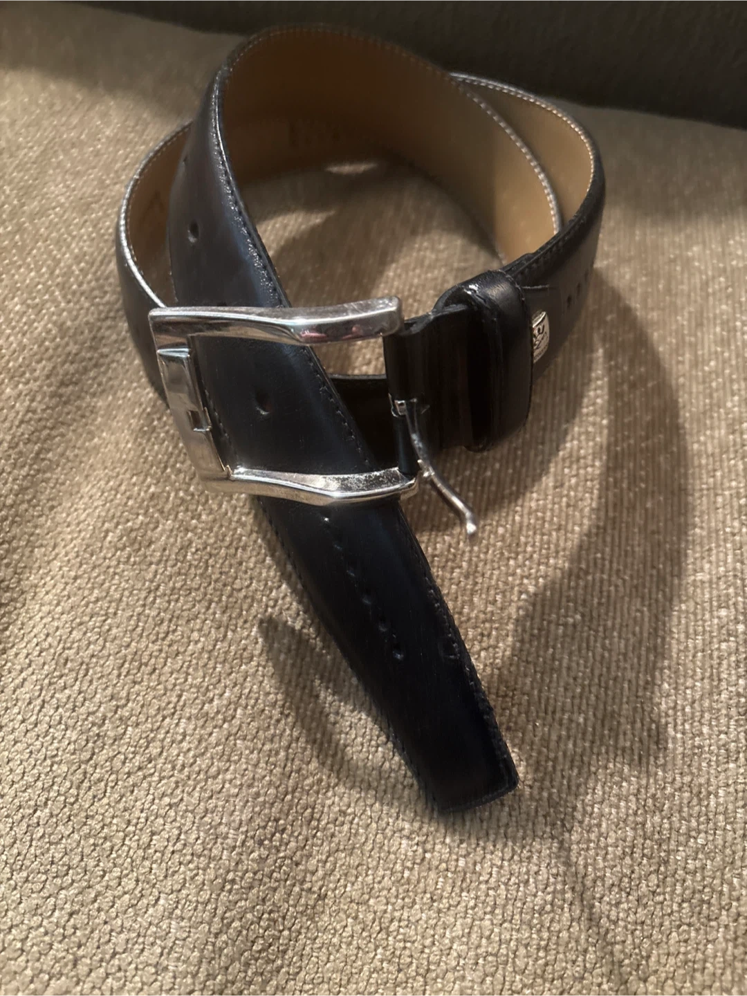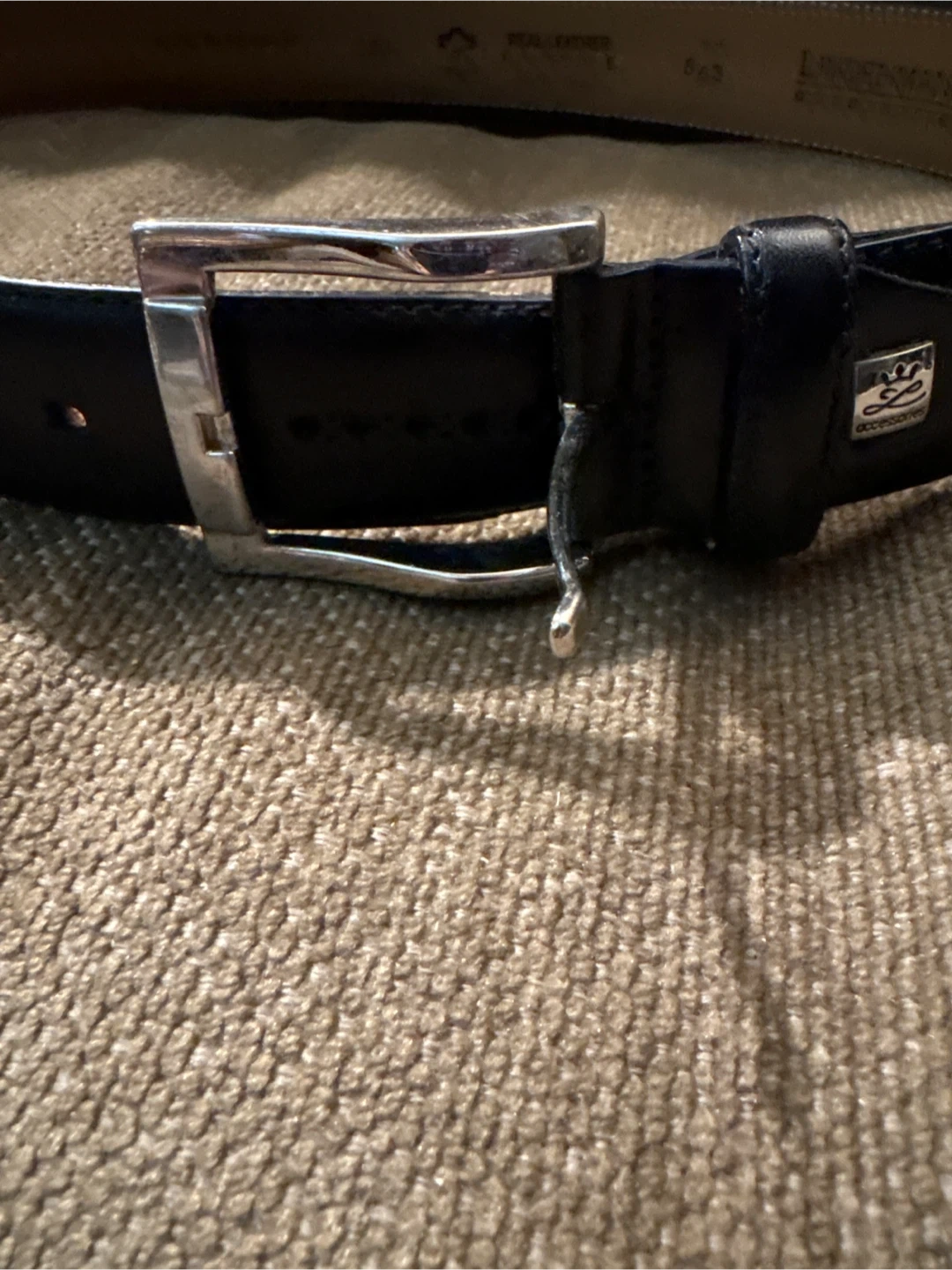 I'm selling a Lindenmann Accessories belt in black leather. It has a silver-tone buckle. The belt is in good condition and ready for a new wardrobe!