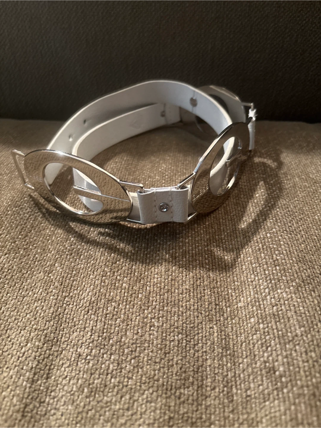Selling a stylish Guess belt made of genuine leather! It's a lovely white colour and a size small. Perfect for adding a touch of elegance to any outfit