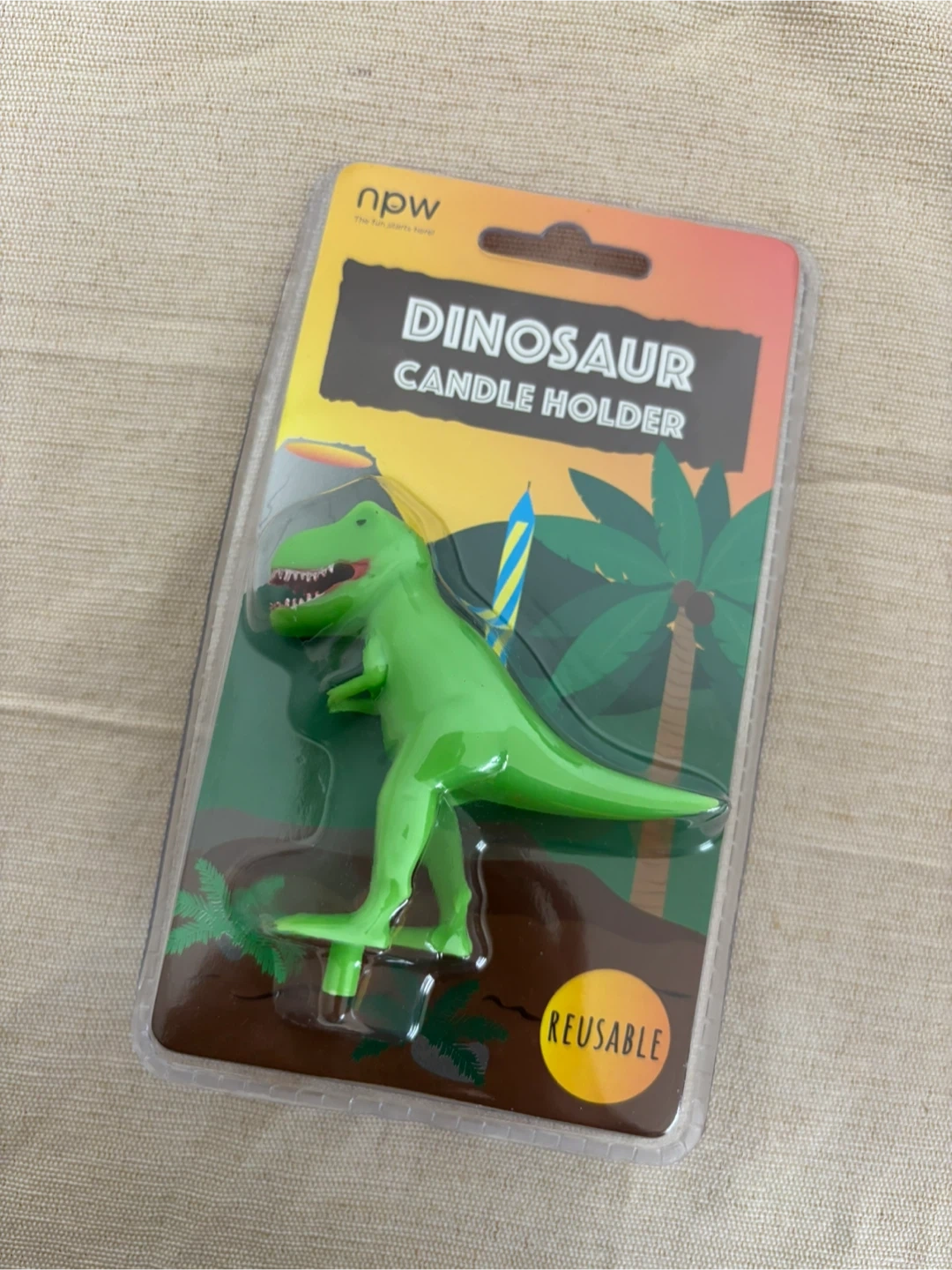A brand new NPW Dinosaur Candle Holder! It's a fun and reusable way to hold candles for birthdays or any special occasion.