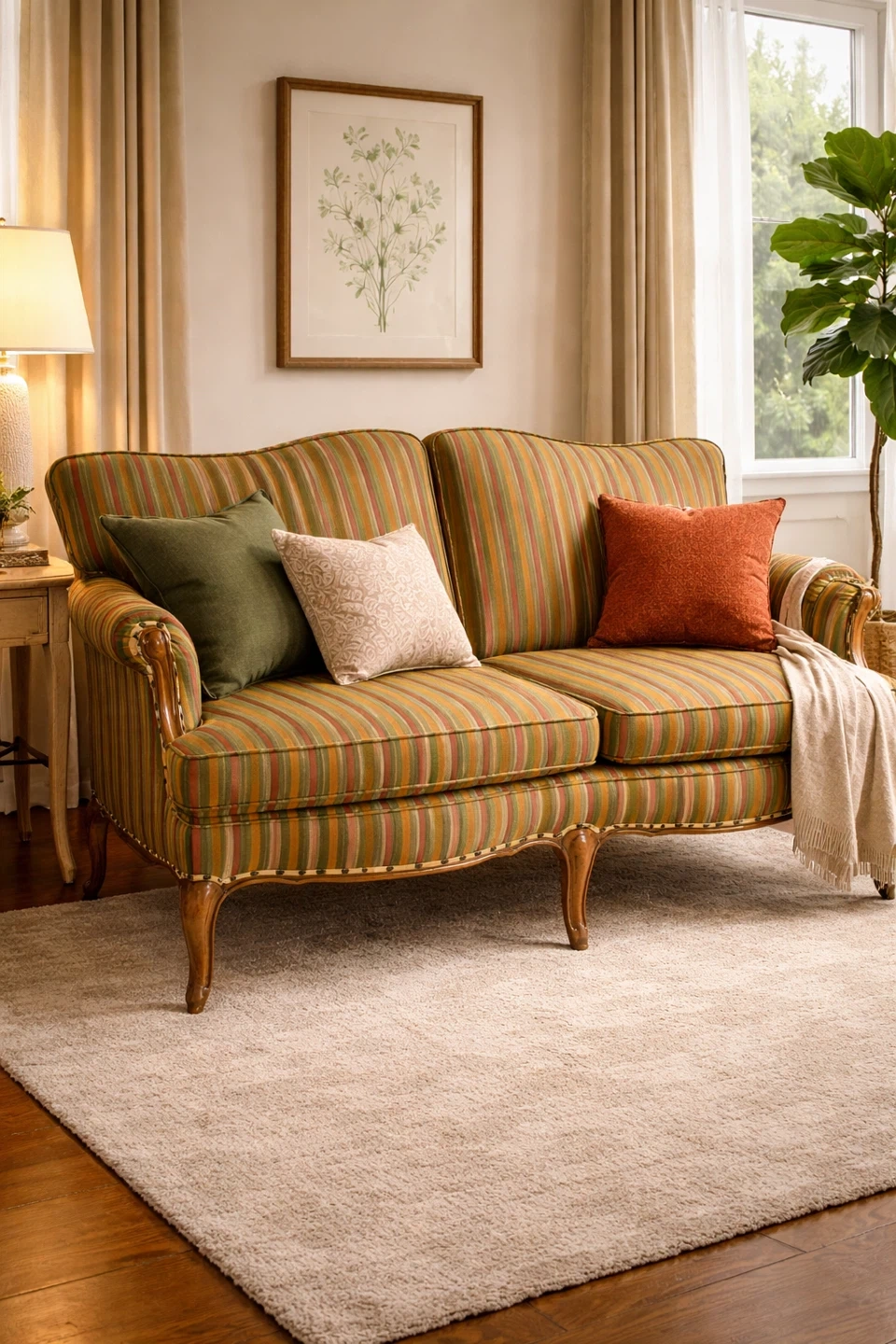 Selling a lovely striped loveseat sofa. It's in great shape and would look great in any living room or den. The striped pattern features a mix of colours. A comfortable and stylish addition to your home!