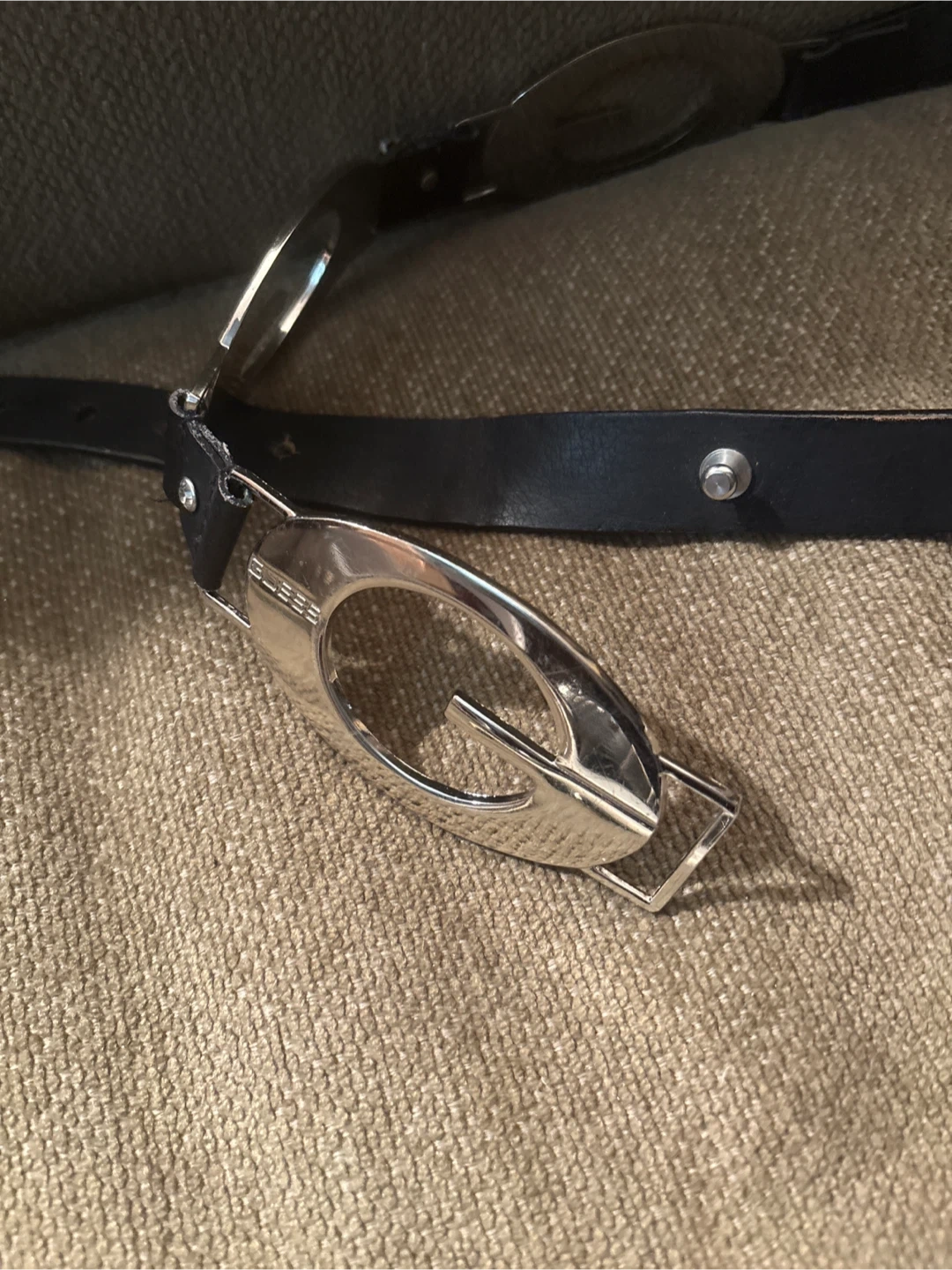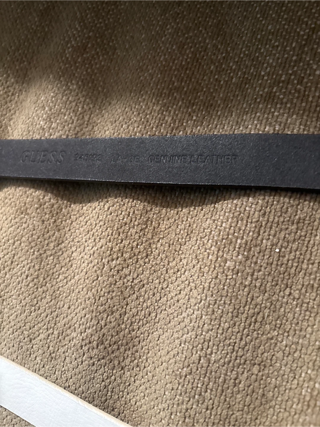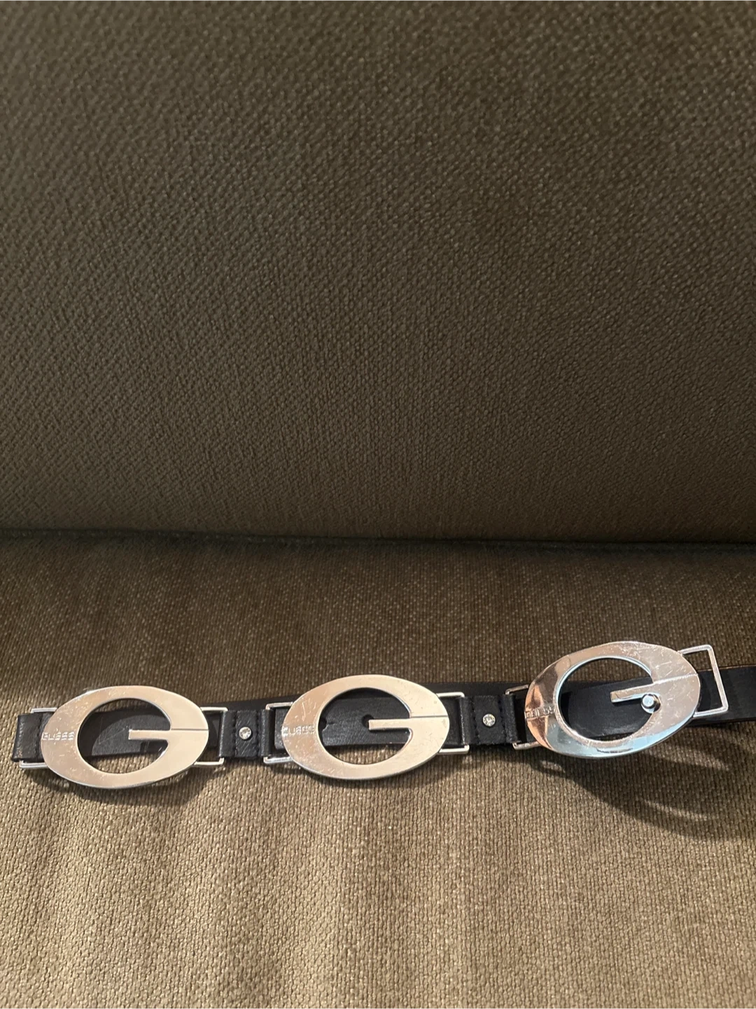 Selling a Guess black leather belt in size womens lg. 27” It features a unique design with the Guess logo. The belt is made of genuine leather.