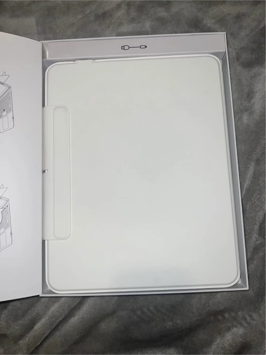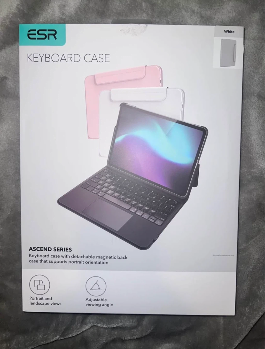 This is an ESR Ascend Series Keyboard Case in white. It comes with a detachable magnetic back that supports portrait orientation. The box is included, and it's in new condition! It also allows for adjustable viewing angles.