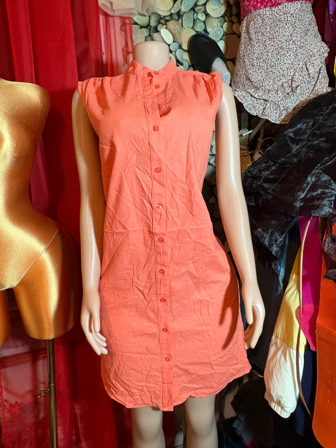 Here's a cute orange sleeveless dress with button-down detailing! It's in good condition and ready for a new home