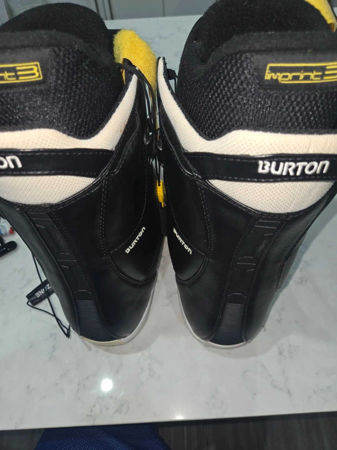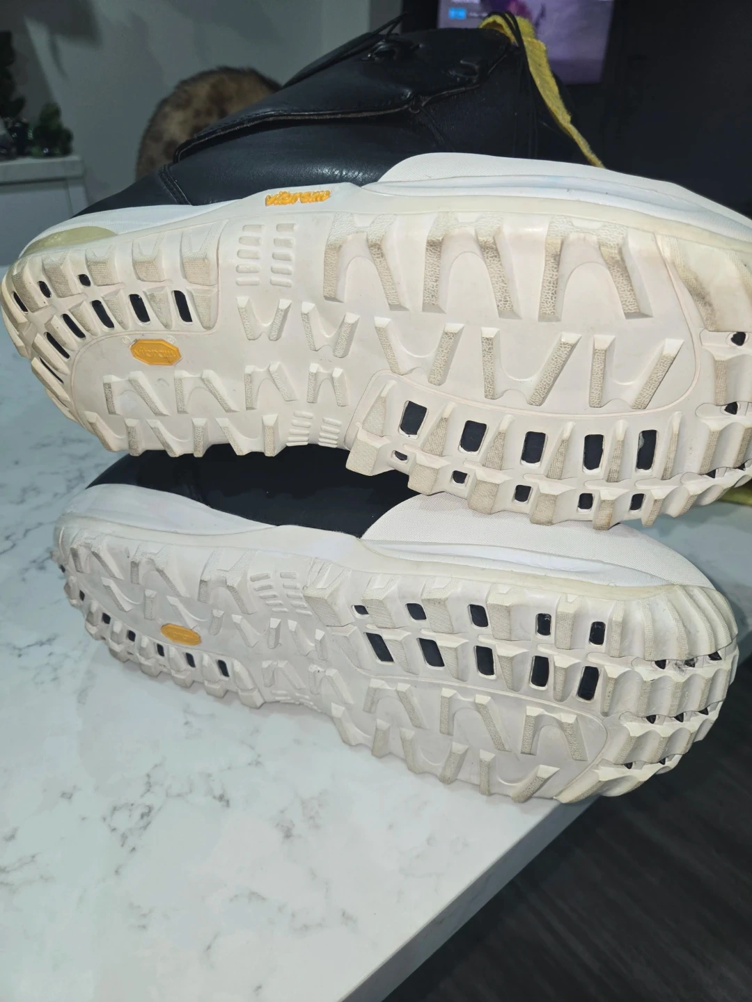 Selling a pair of 2008 Burton serow snowboard boots. Size 12. They're in good condition and ready for the slopes! These boots feature a black and white design with a yellow accent on the tongue. They also have the Vibram sole for great traction. Used twice. Not a tear or a scratch