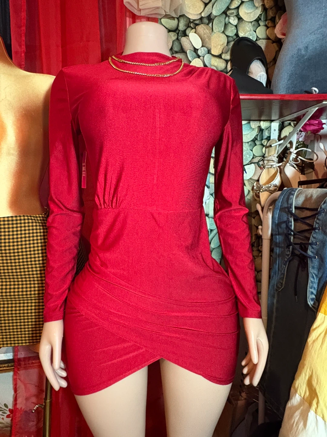 A stylish red long sleeve mini dress is available! It's perfect for a night out or a special occasion