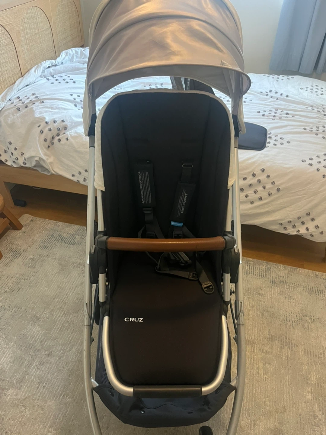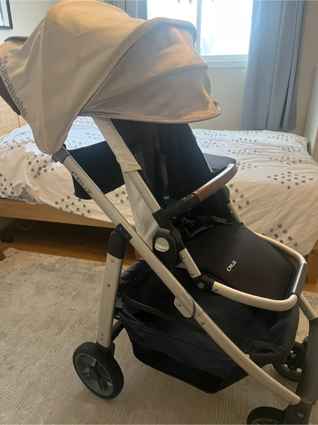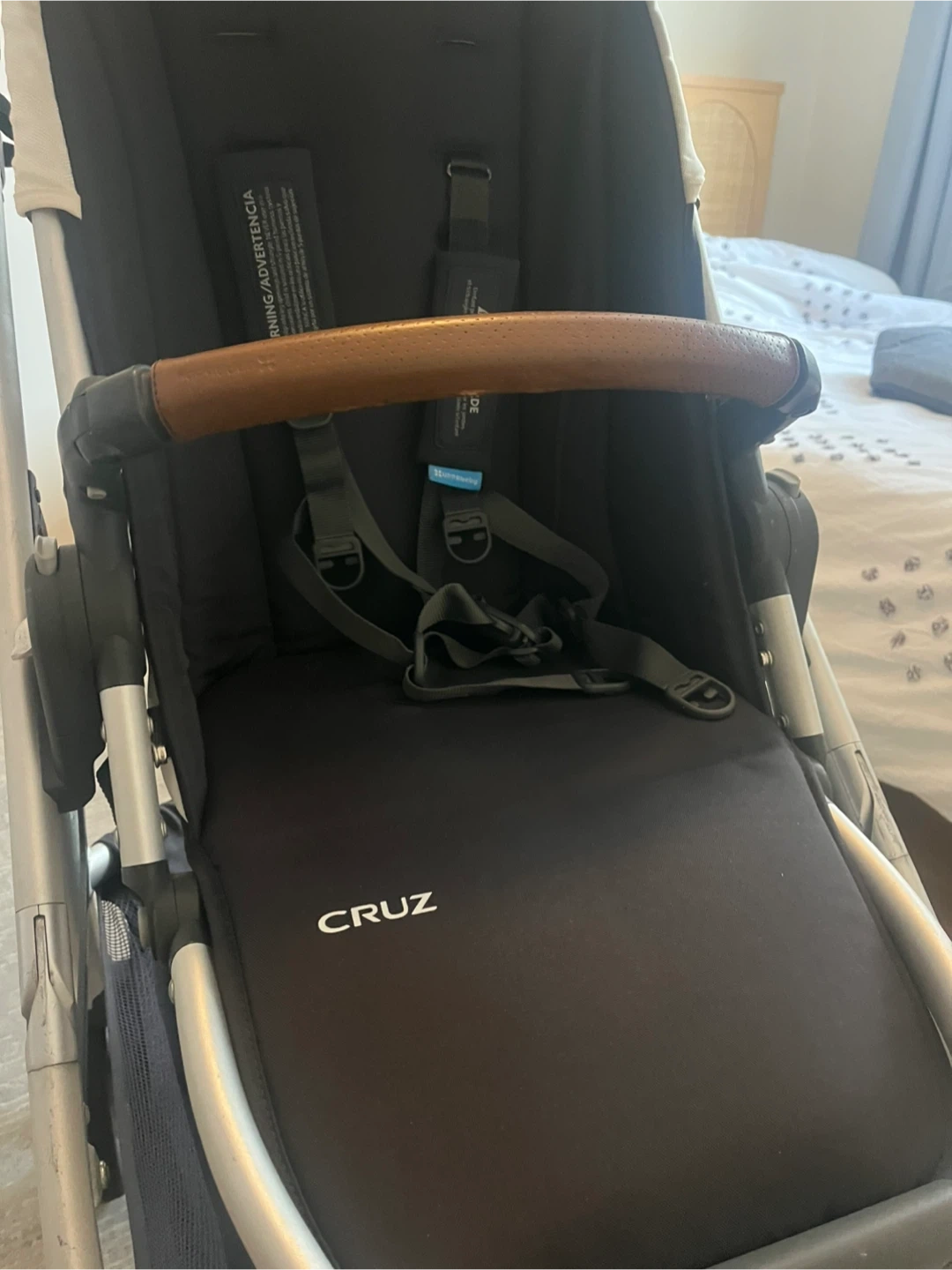 Selling a gently used UPPAbaby Cruz stroller. It's in great condition and ready for a new family. The stroller features a brown leather handle and a spacious storage basket. Perfect for navigating city streets or park trails!