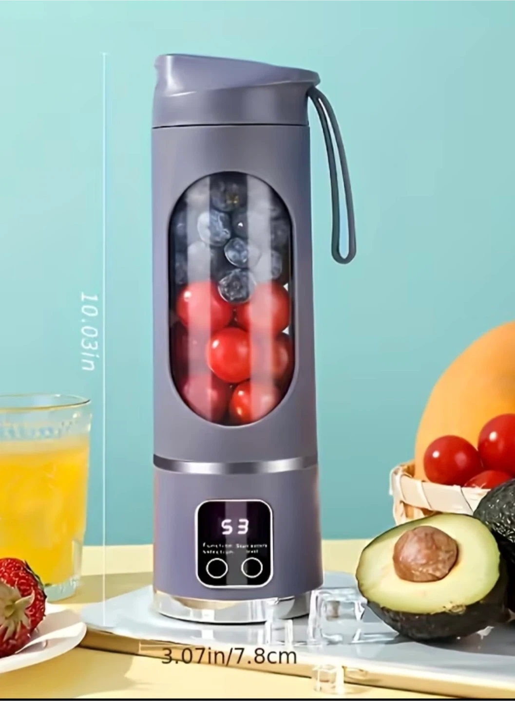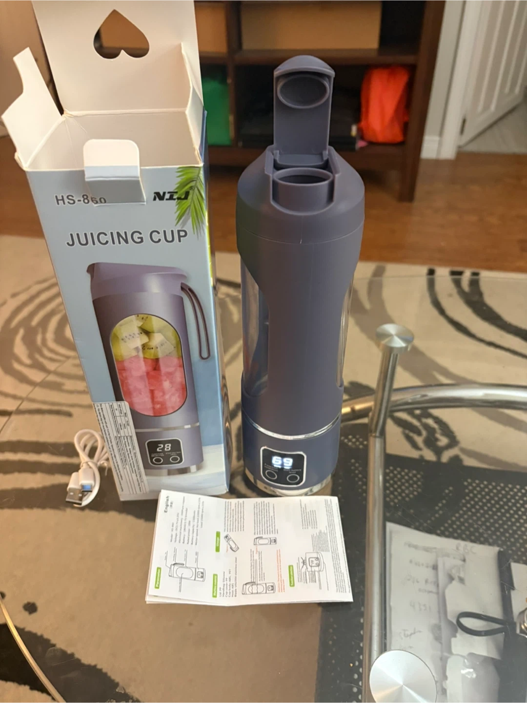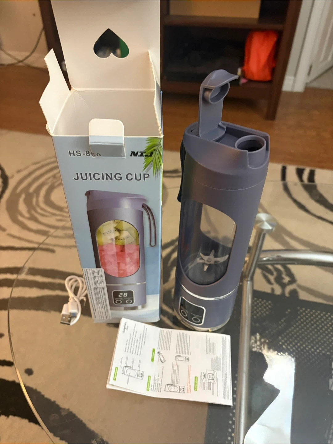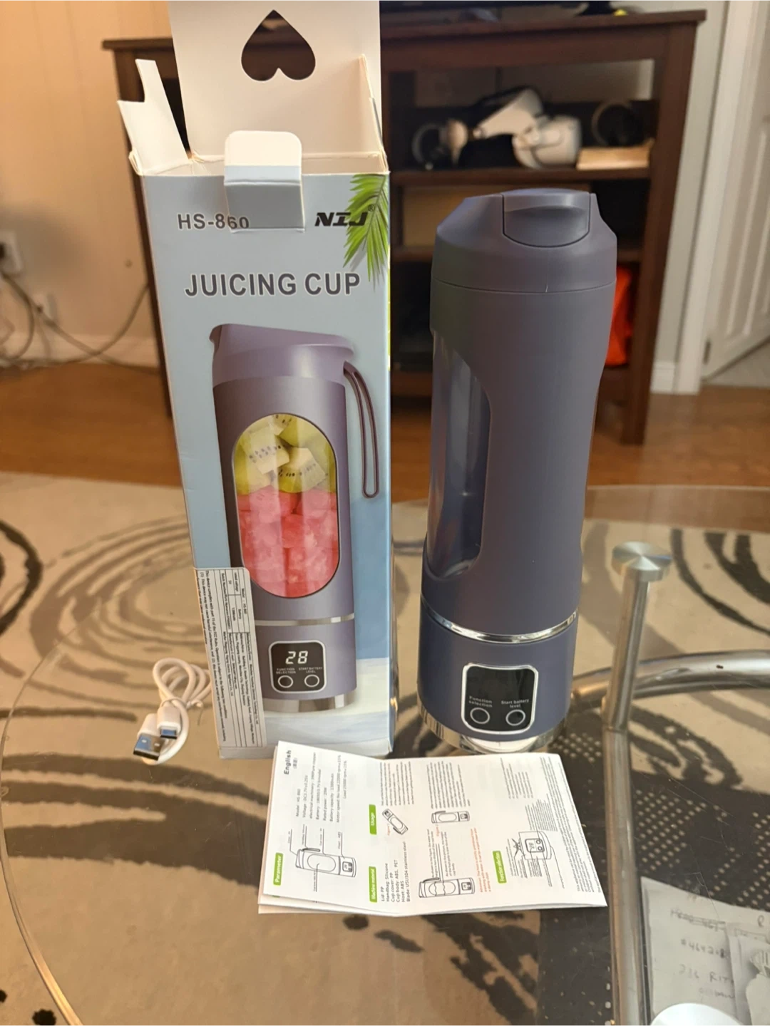 I'm selling a NJI HS-860 Juicing Cup in purple! It comes with the box, charger, and instructions. It measures approximately 10 inches tall and 3 inches in diameter.