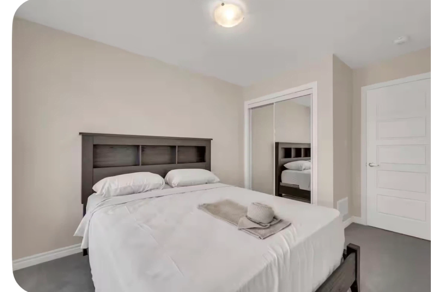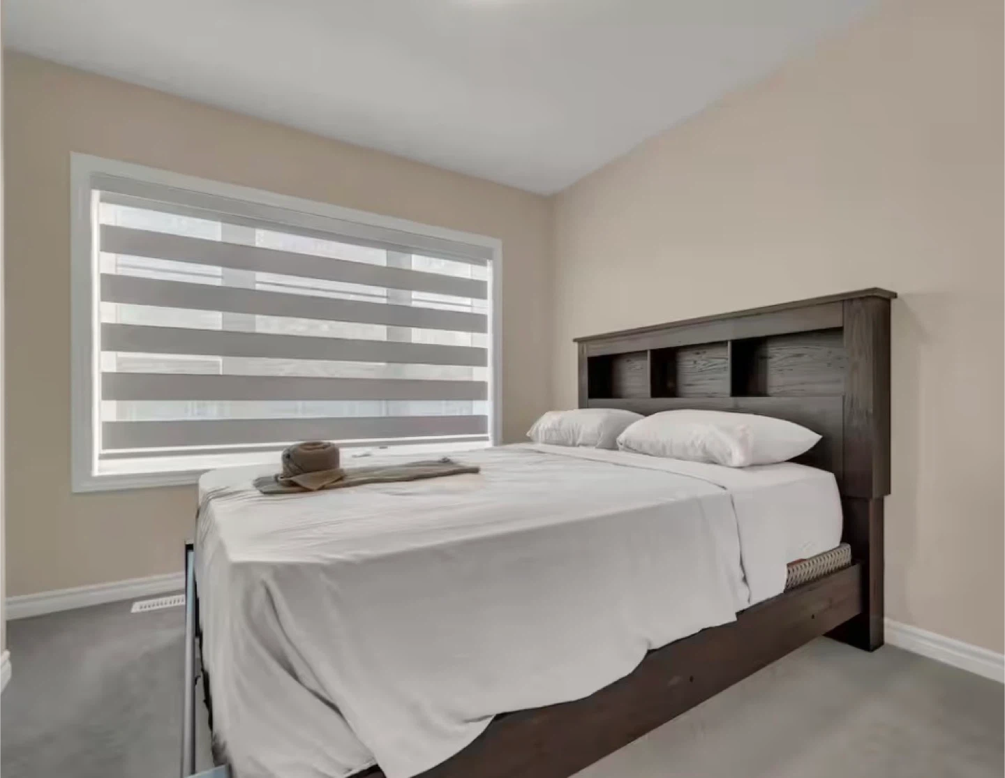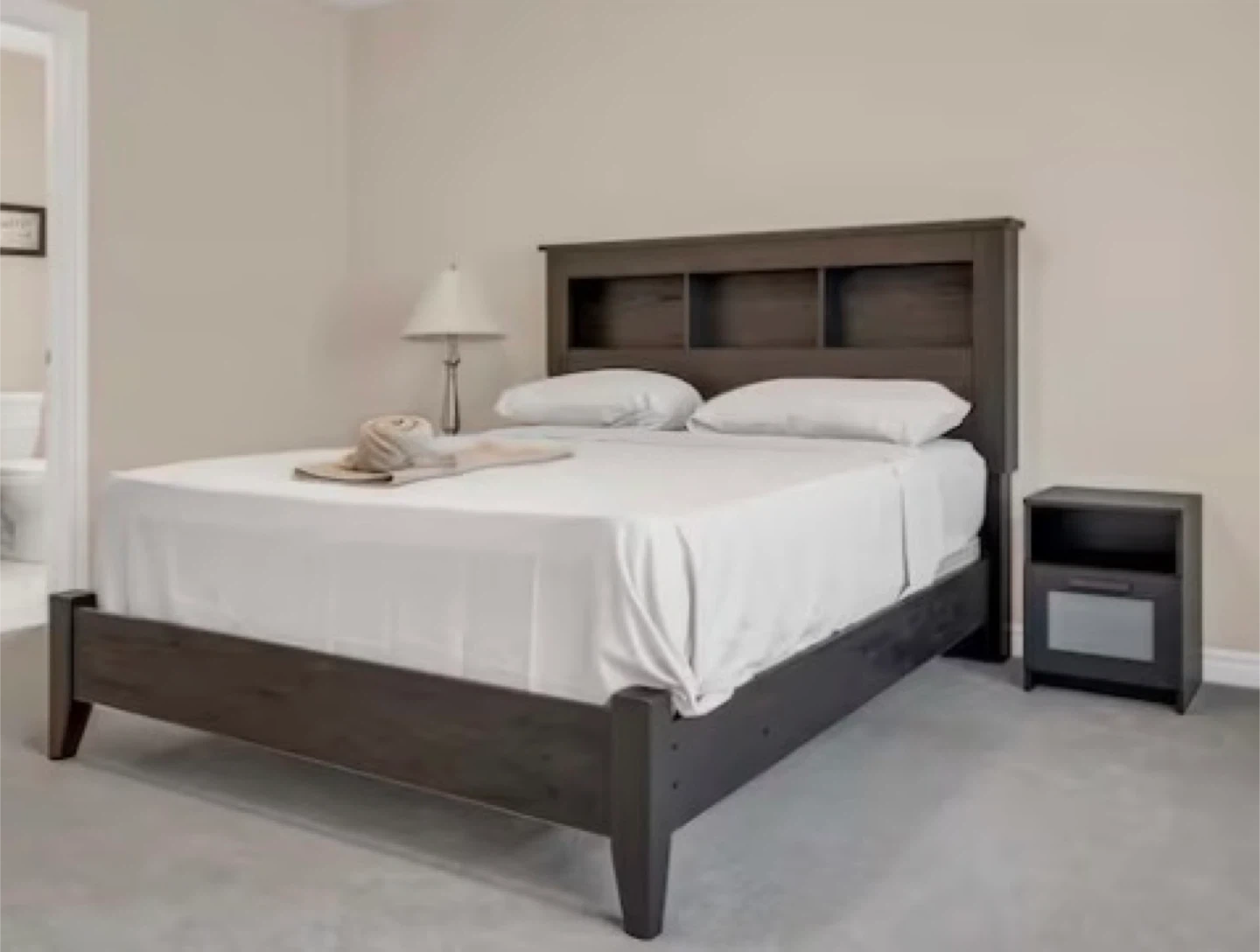 Selling a lovely queen size bed frame. It features a stylish headboard with built-in shelving, perfect for storing books or displaying decorative items. The bed frame is in great condition and would be a wonderful addition to any bedroom. Mint condition (used for staging). Comes with ikea night table.