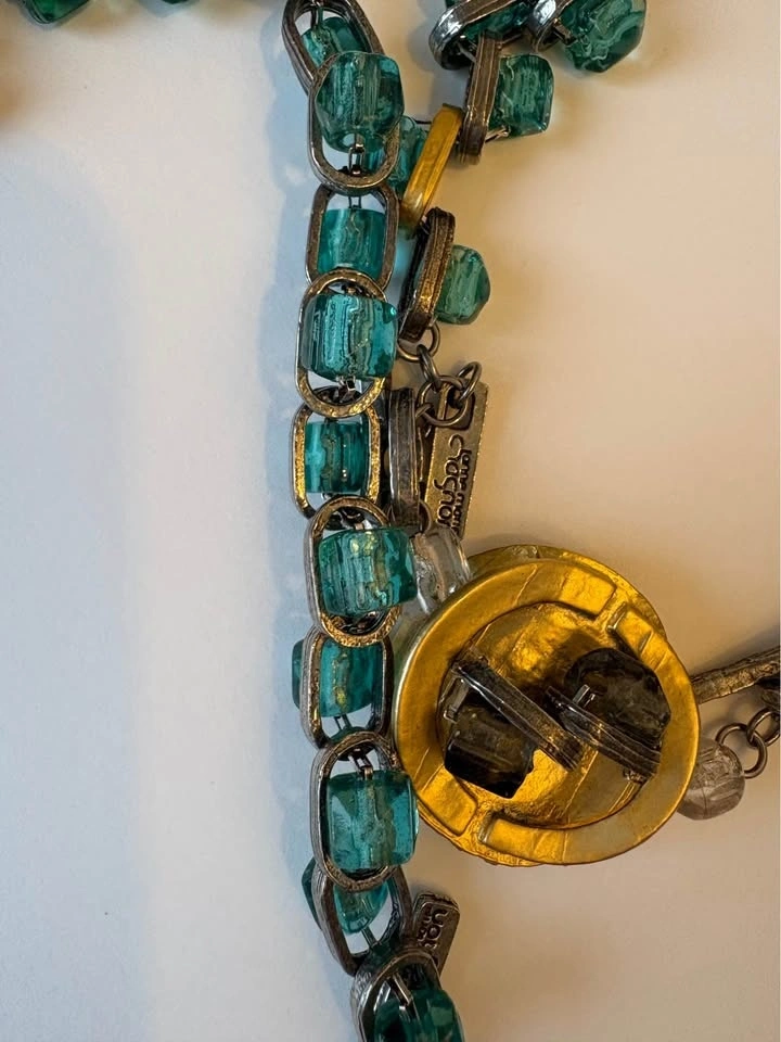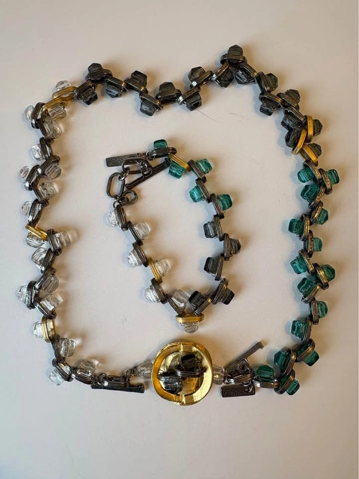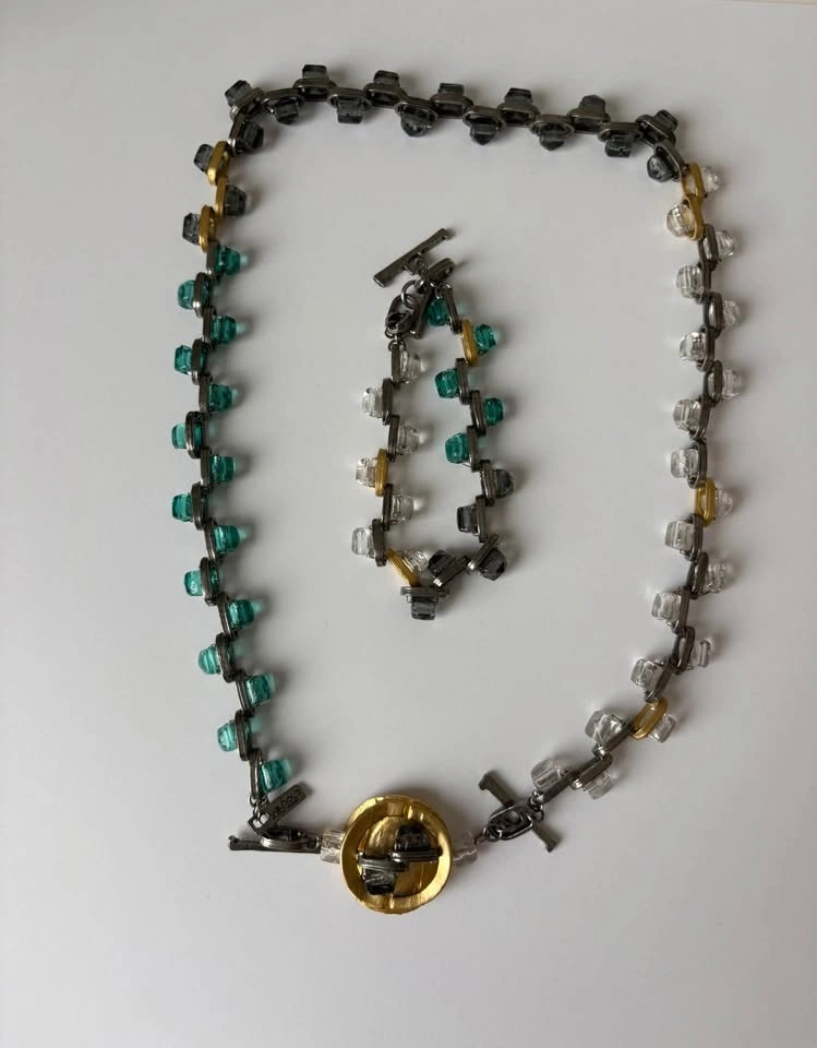 Elevate your collection with this handcrafted jewelry set from celebrated Montreal artist Anne-Marie Chagnon. Known for her wearable art, this set features organic, hand-sculpted pewter and luminous teal and clear glass beads.