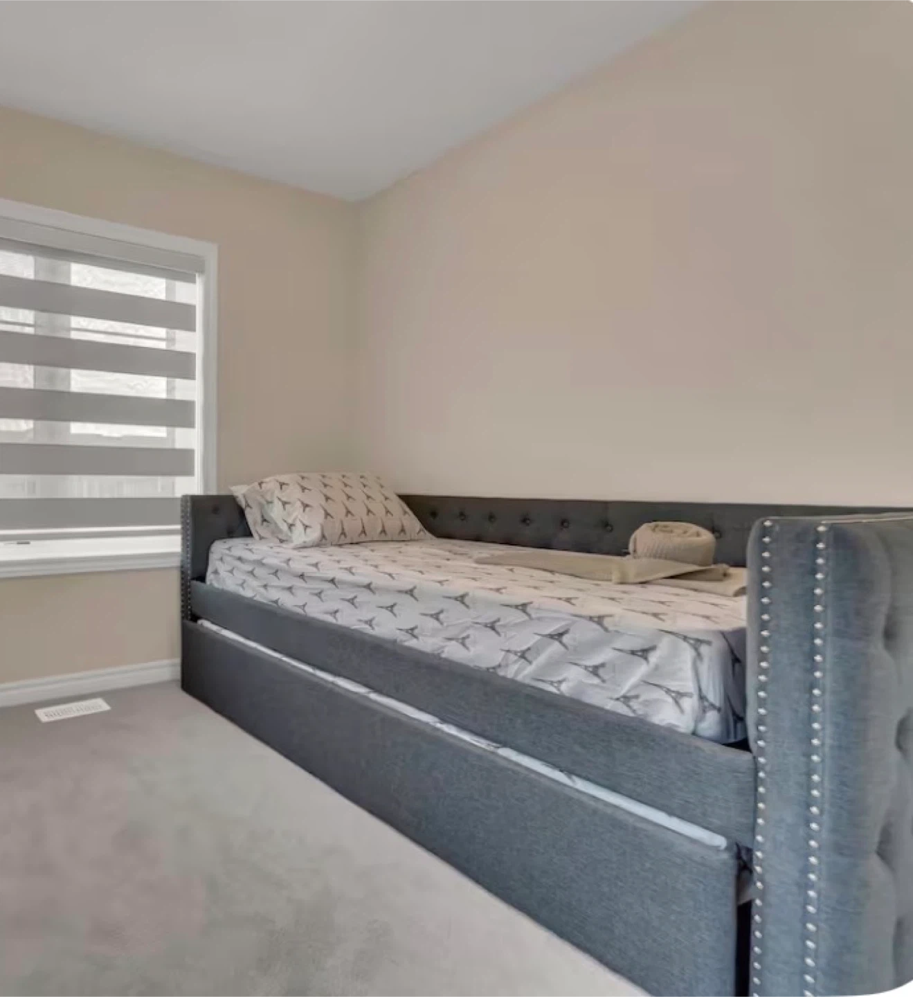 Selling a grey daybed that's in excellent condition! It comes with a trundle, perfect for extra sleeping space for guests or kids. The daybed features a stylish design with a tufted headboard and nailhead trim. The neutral grey colour will fit with any room's decor. Used for staging only…original price is 750. Comes with 2 single mattresses. The bottom pulls out and becomes a bed as well.