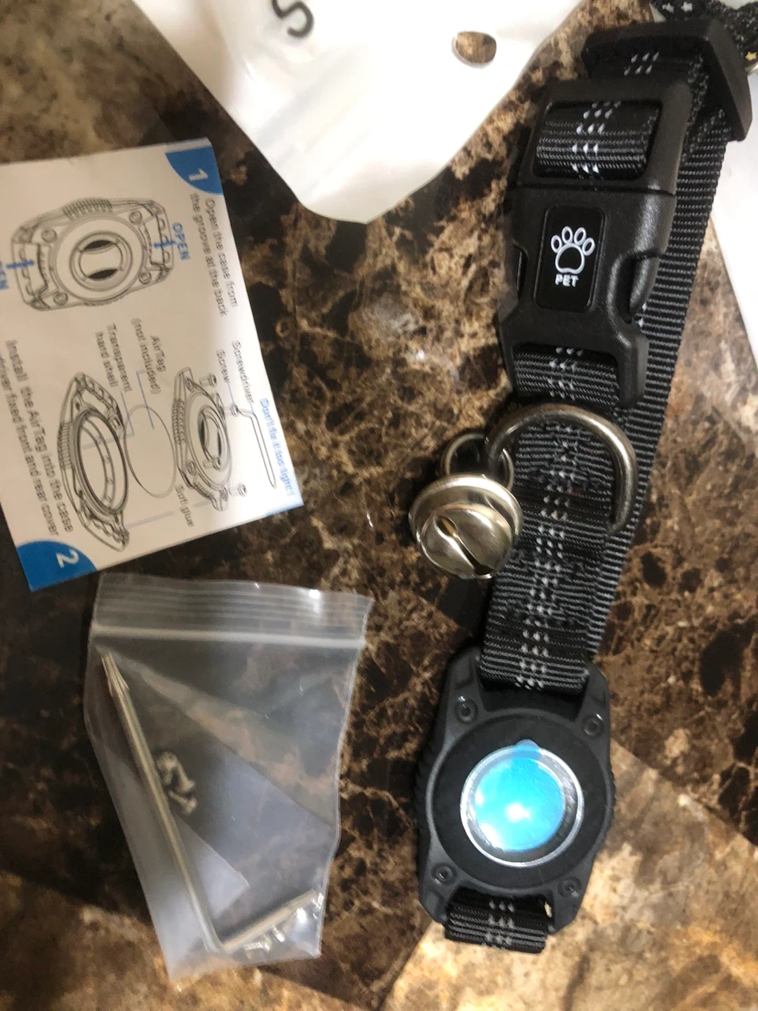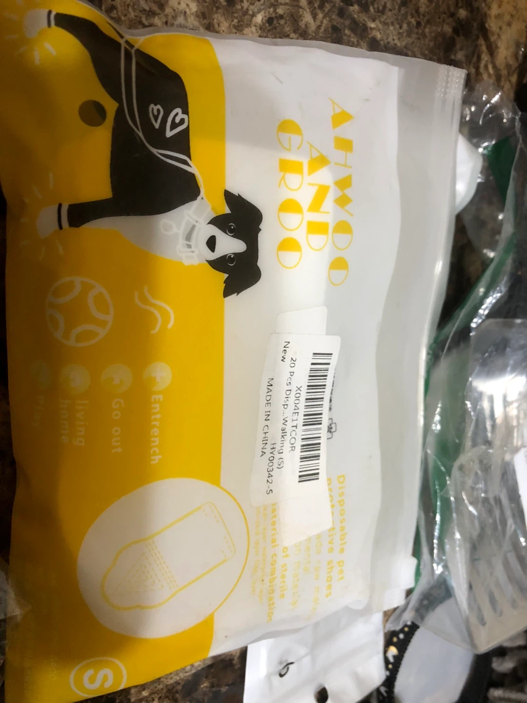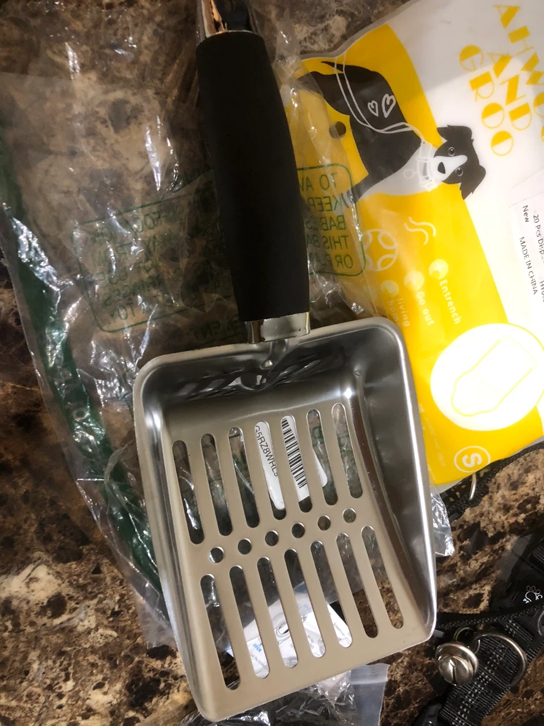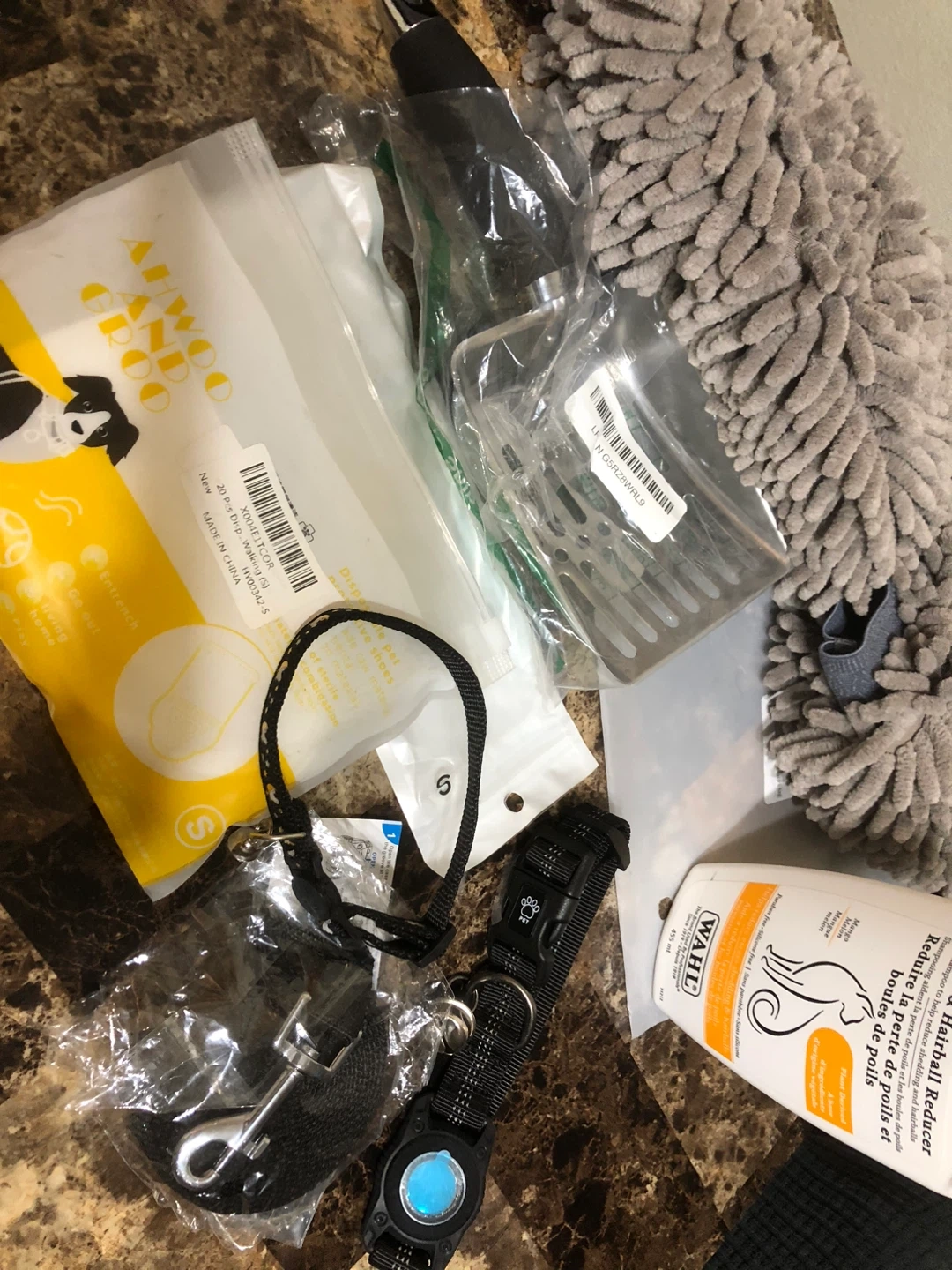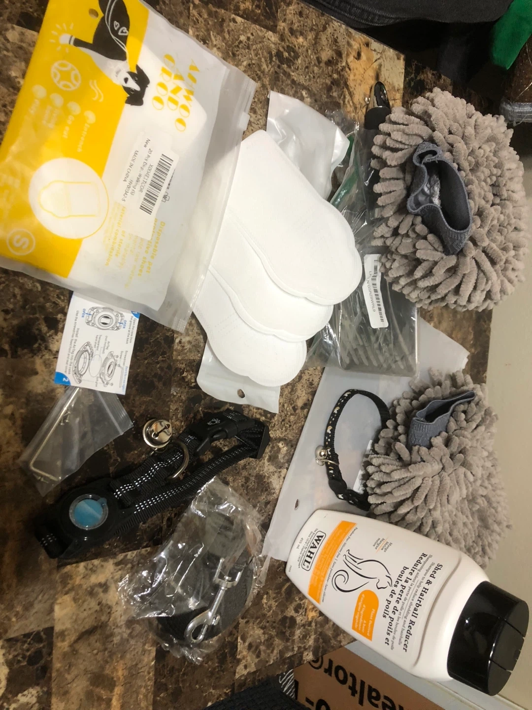 Selling a all new small size variety of pet supplies! There's a black pet collar with a paw print buckle and a bell, as well as disposable pet paw cleaning mitts from AIWOO AND GROO in size S. Also included is a metal pet scoop and Wahl hairball reducing shampoo for pet and air tag pet collar for dog &cat !
