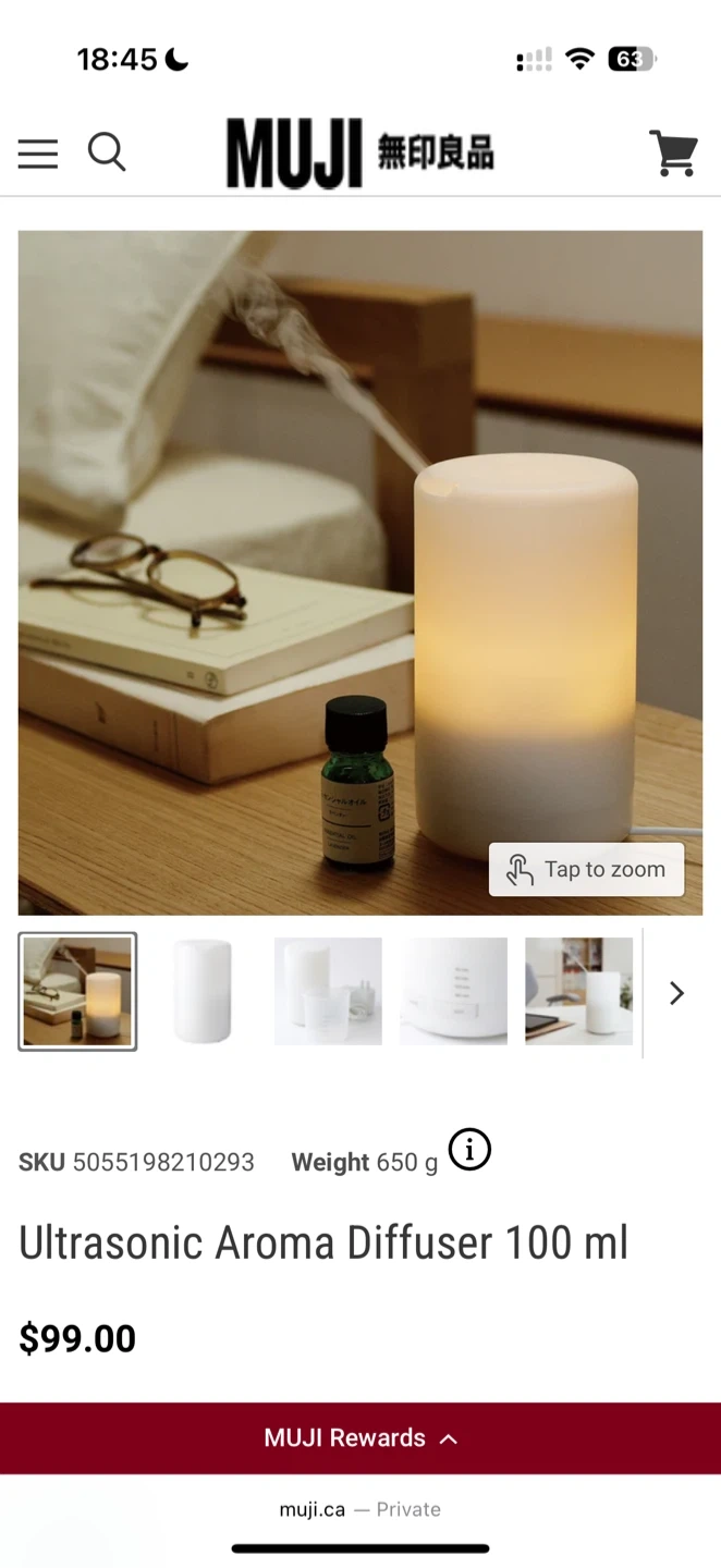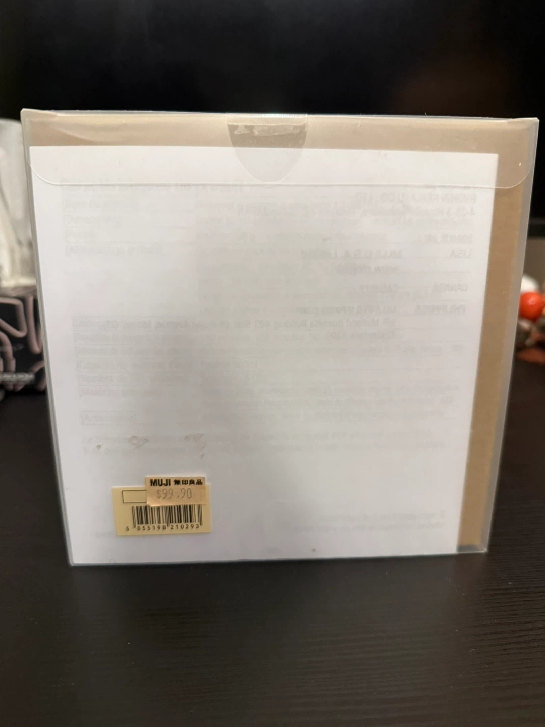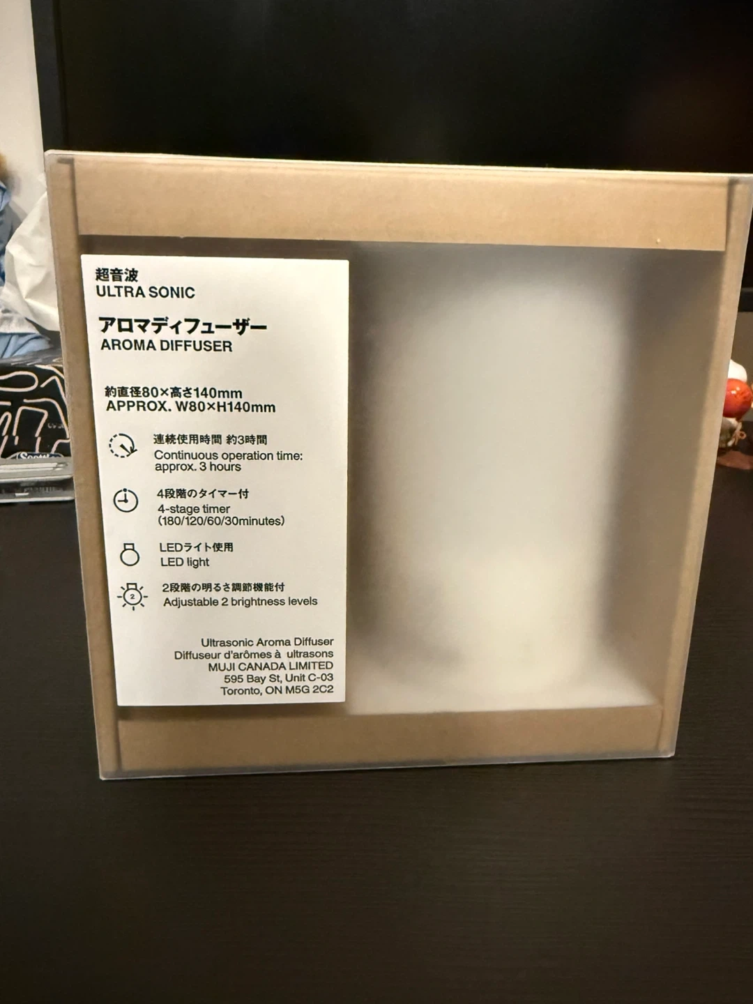 Selling a MUJI Ultrasonic Aroma Diffuser, 100 ml. It's in great condition and comes with the original box. The diffuser has a continuous operation time of approximately 3 hours and features adjustable brightness levels.
