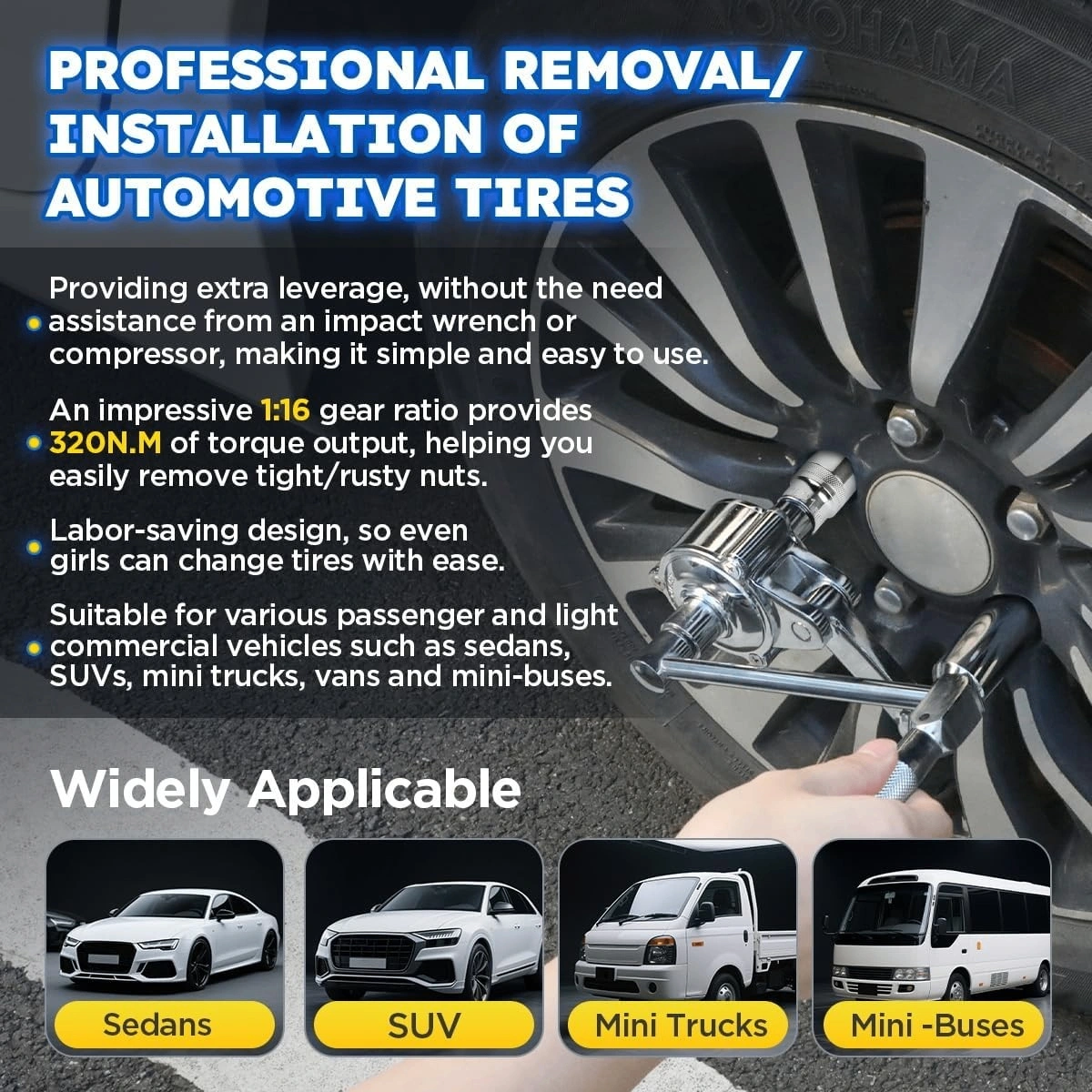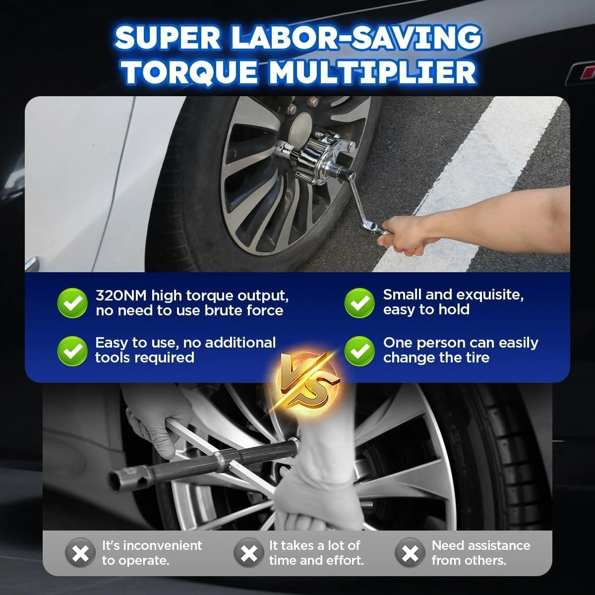 The Torque Multiplier Set is especially suitable for automotive maintenance and repairs, especially when dealing with the difficult to remove tire nuts