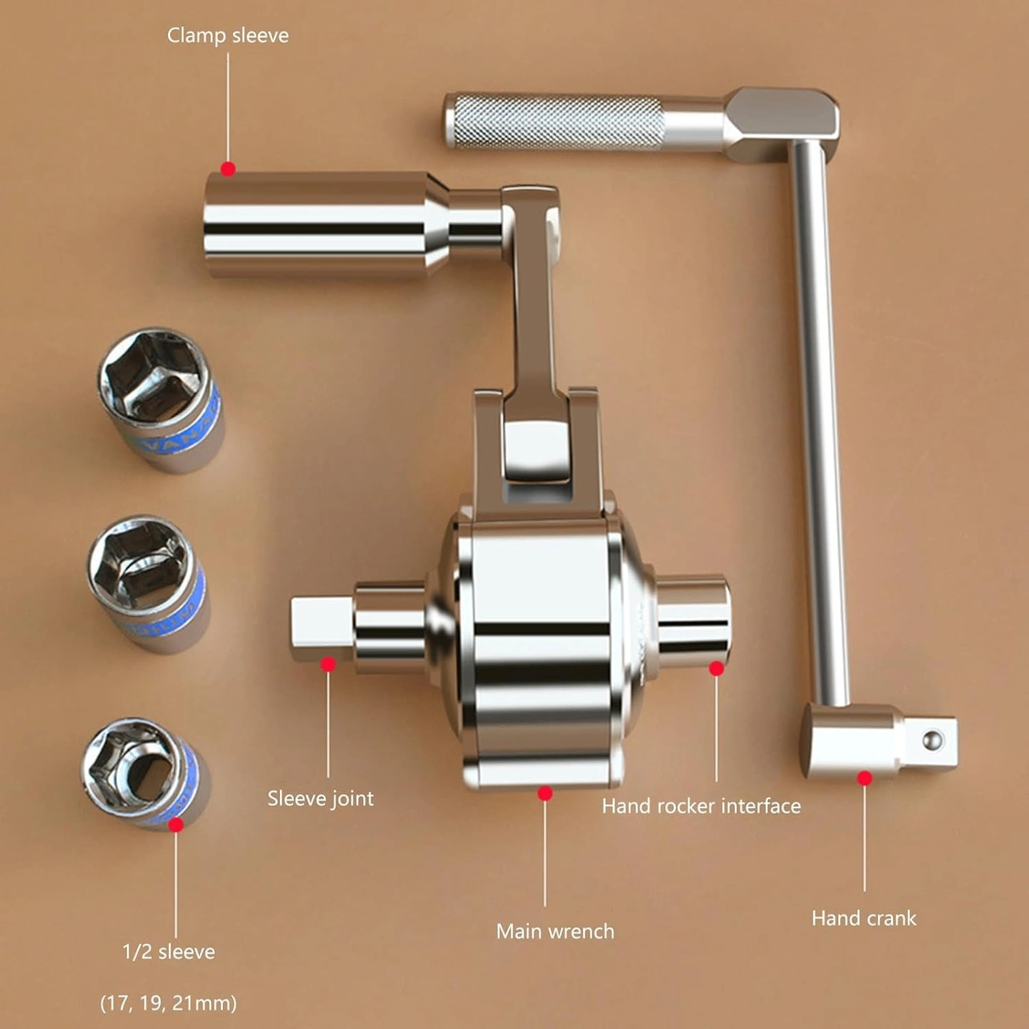The Torque Multiplier Wrench Set is equipped with 17mm, 19mm, and 21mm wrenches to fit various sizes and types of nuts for improved versatility and practicality