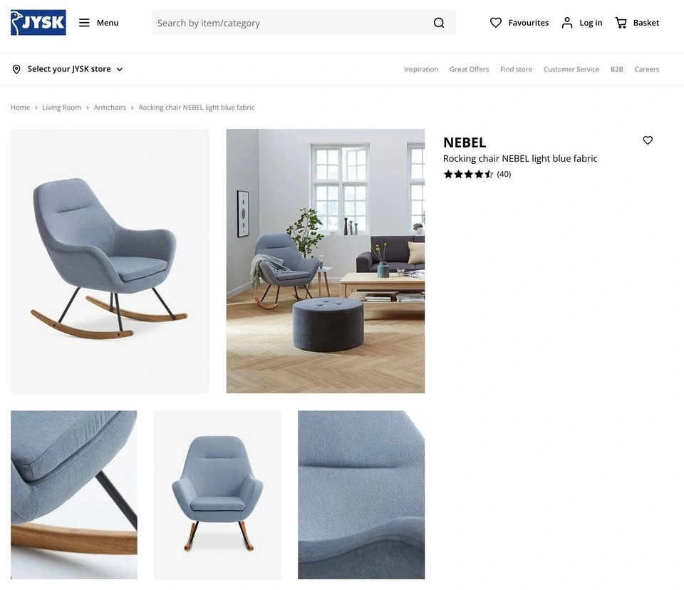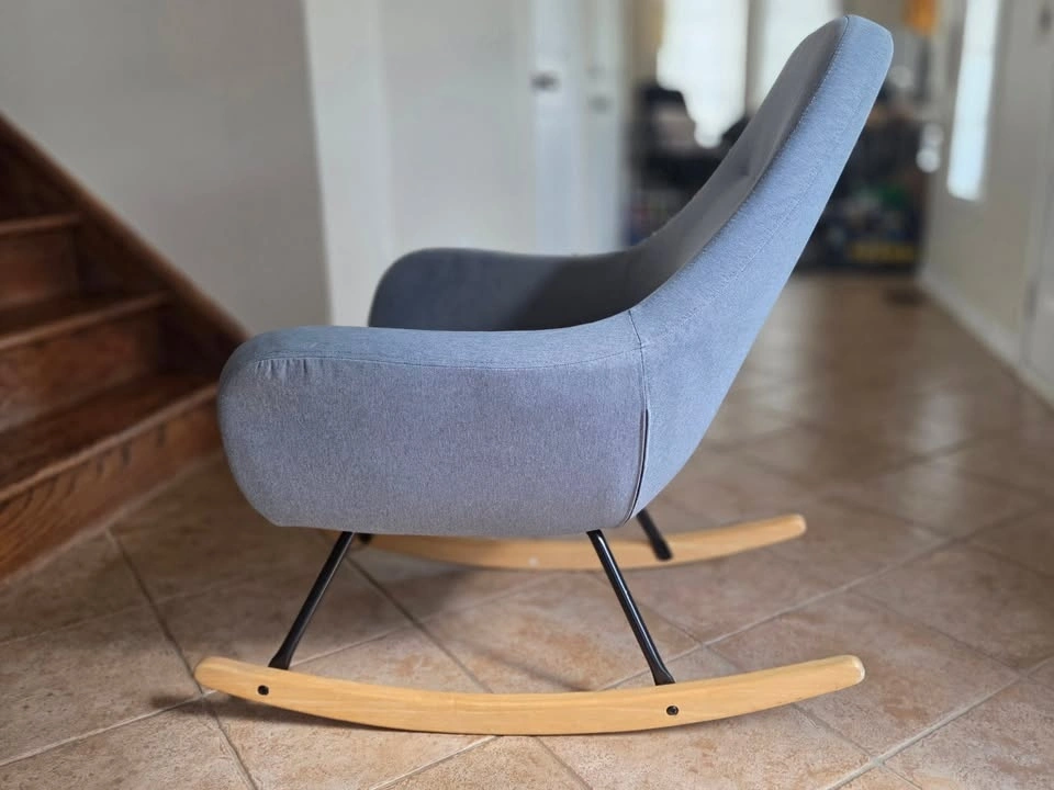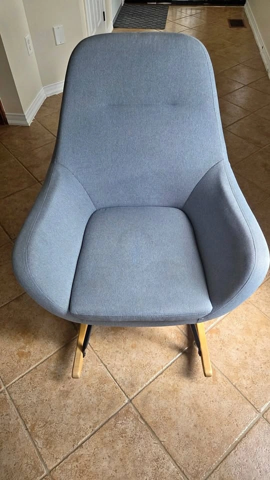 Comfortable and stylish rocking chair from JYSK in light blue fabric.