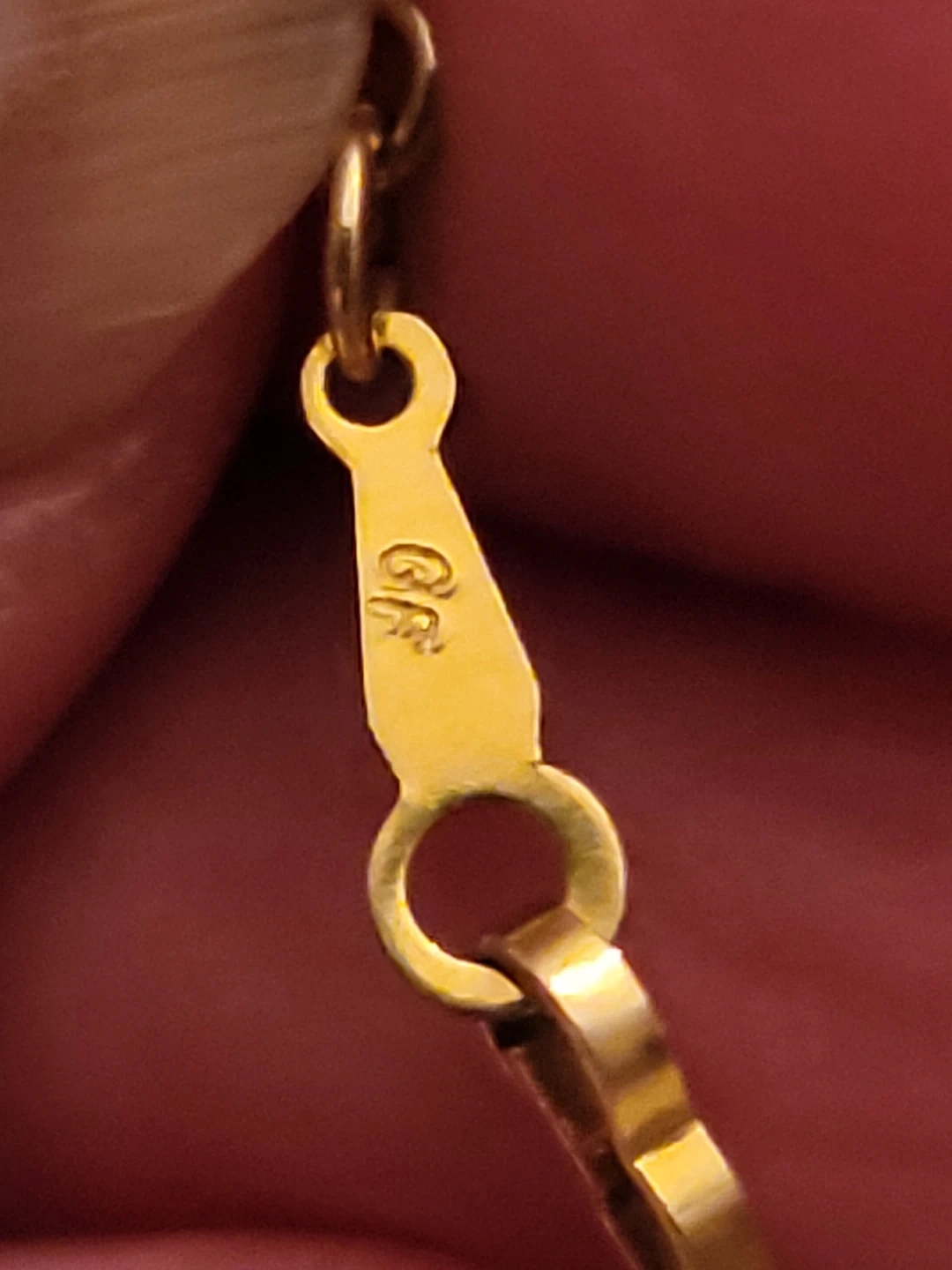 Vintage gold filled (GF) necklace with a unique triangle pendant. (Not gold filled) The pendant has a beautiful reddish-purple colour. It's a great piece to add to your jewellery collection!