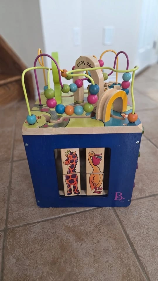 Excellent condition B. Toys Zany Zoo wooden activity cube. Five sides of fun to keep your toddler busy and learning!