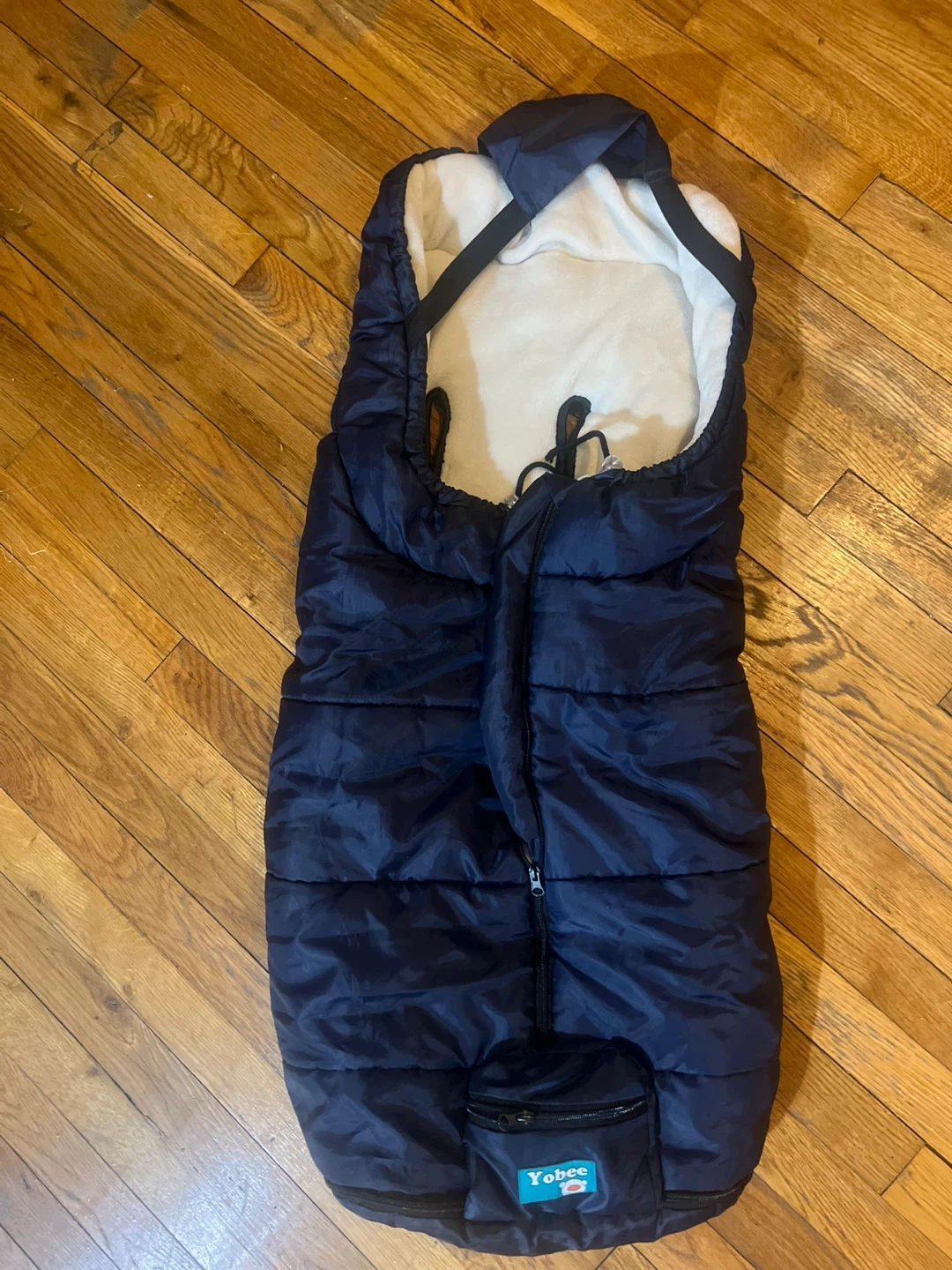 Keep your little one cozy with this Yobee baby bunting bag! It’s a great way to keep them warm during stroller rides or outings in cooler weather. The bag is navy blue and in great condition.