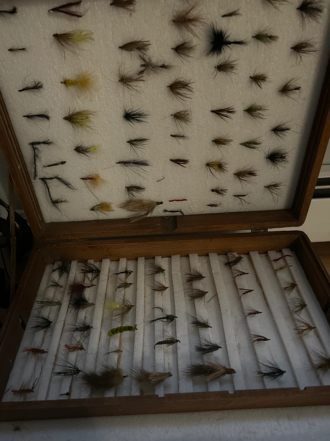 Selling a collection of fly fishing lures in a wooden box. The box is in good condition and contains an assortment of different fly patterns. Perfect for any angler!