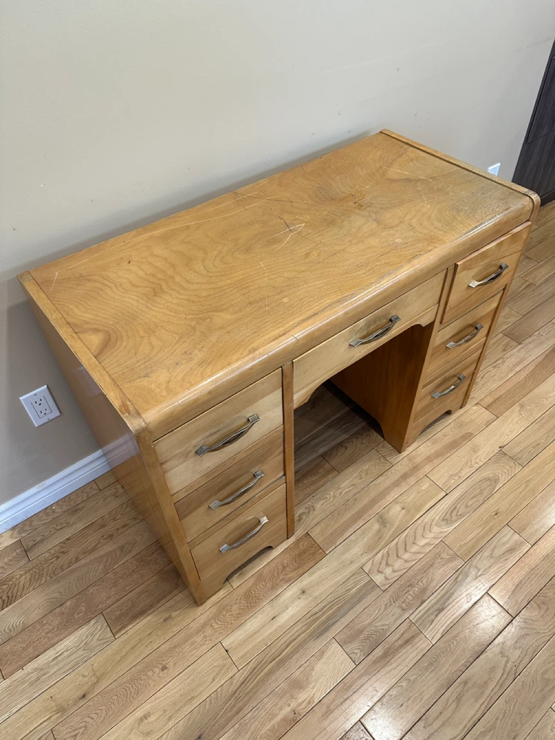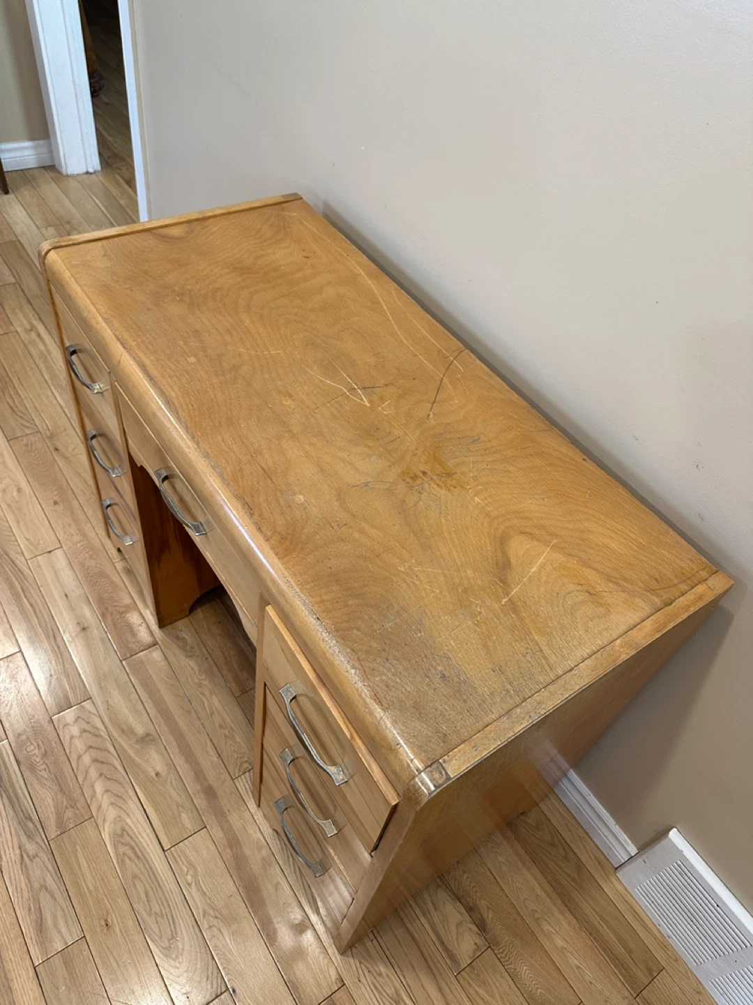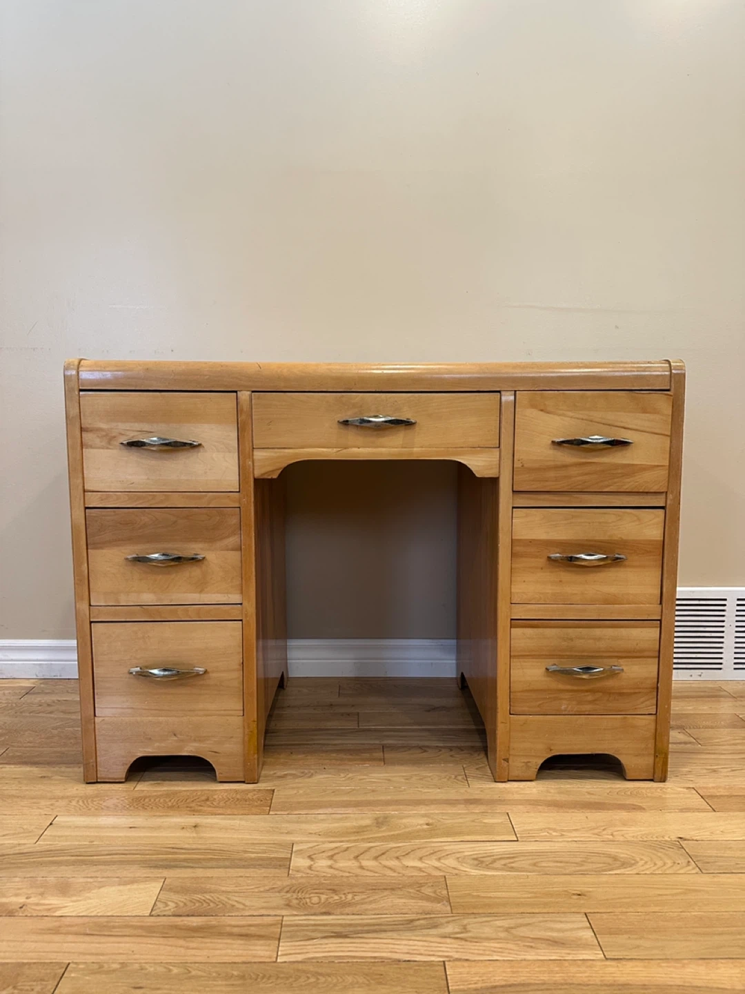 Beautiful vintage Art Deco–style waterfall desk crafted from solid wood. This piece is in good condition for its age and offers both charm and functionality.