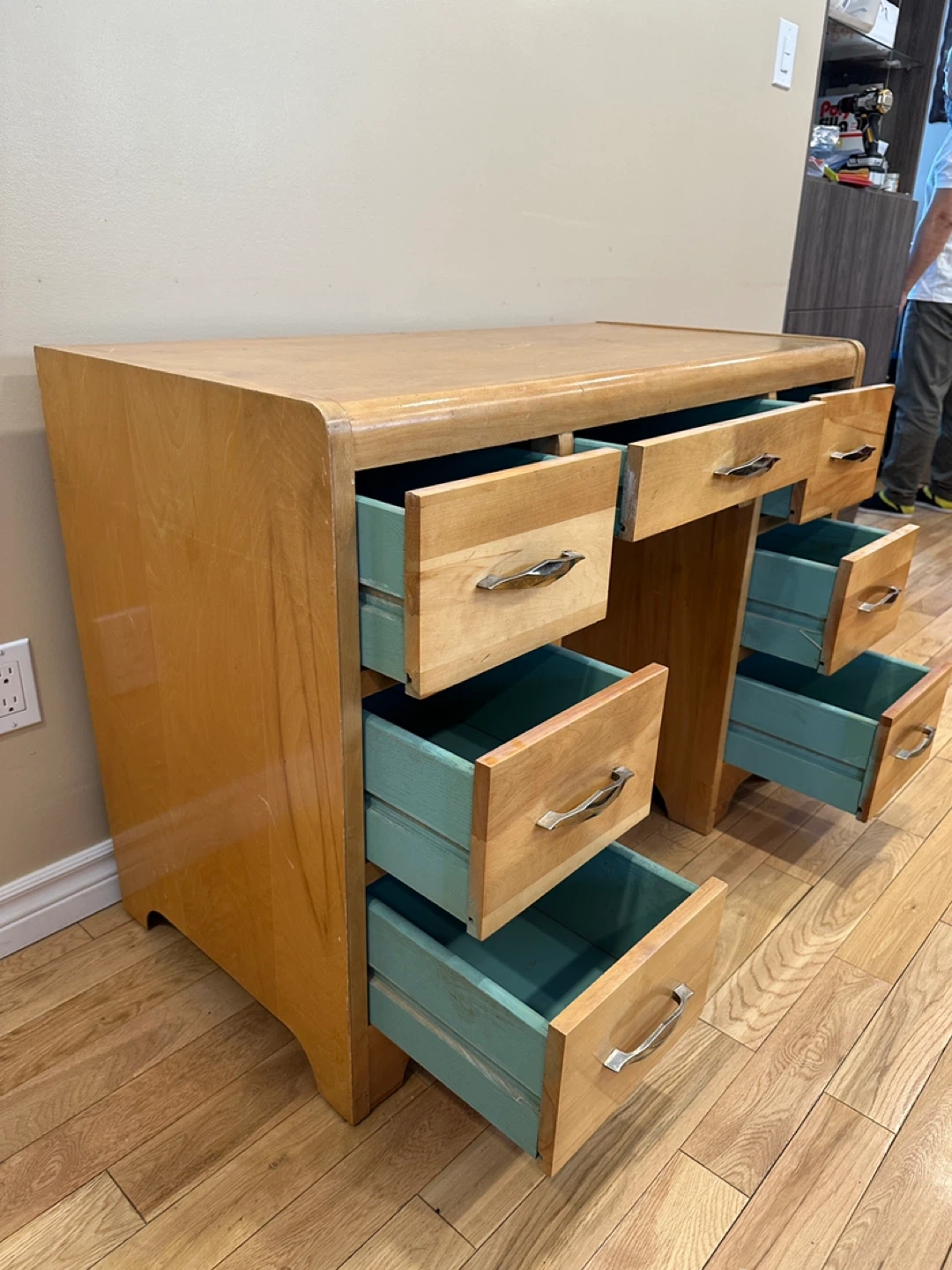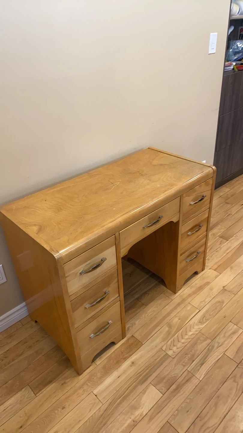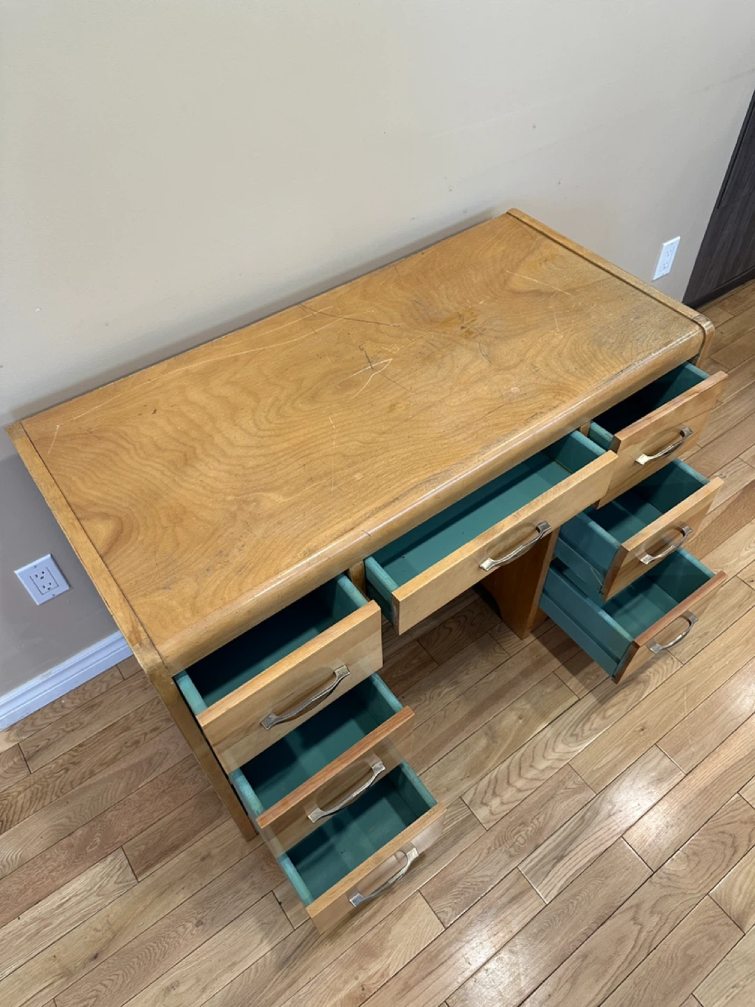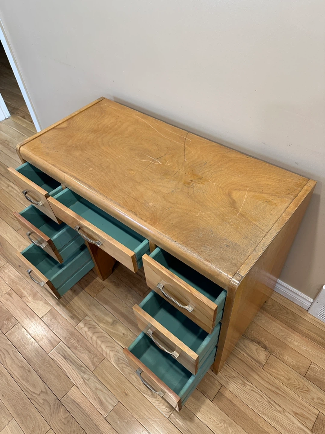 Beautiful vintage Art Deco–style waterfall desk crafted from solid wood. This piece is in good condition for its age and offers both charm and functionality.