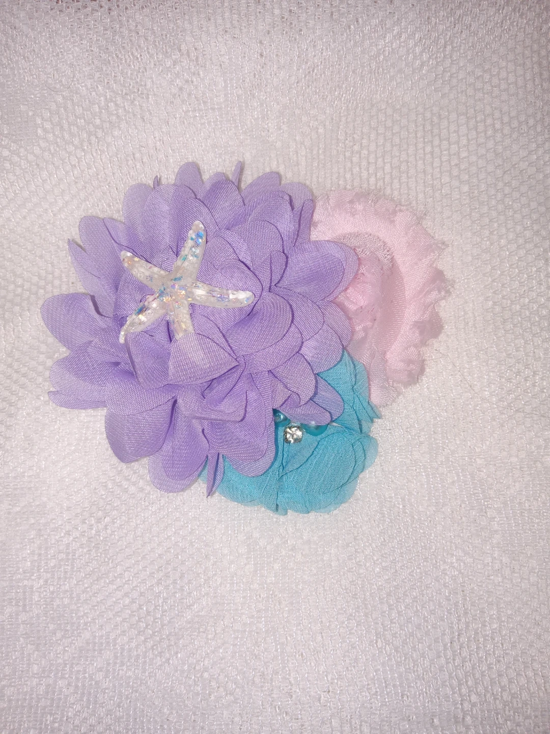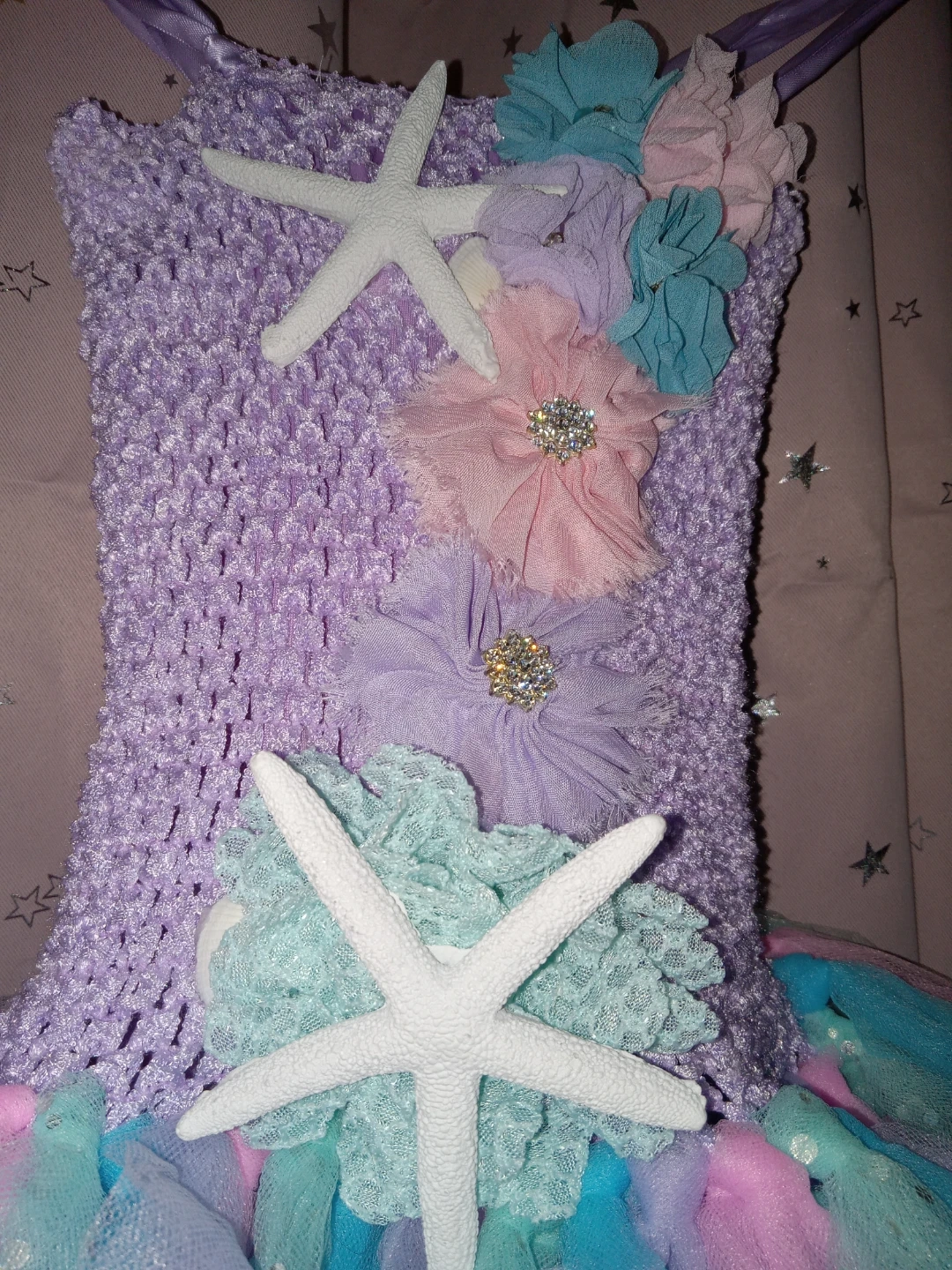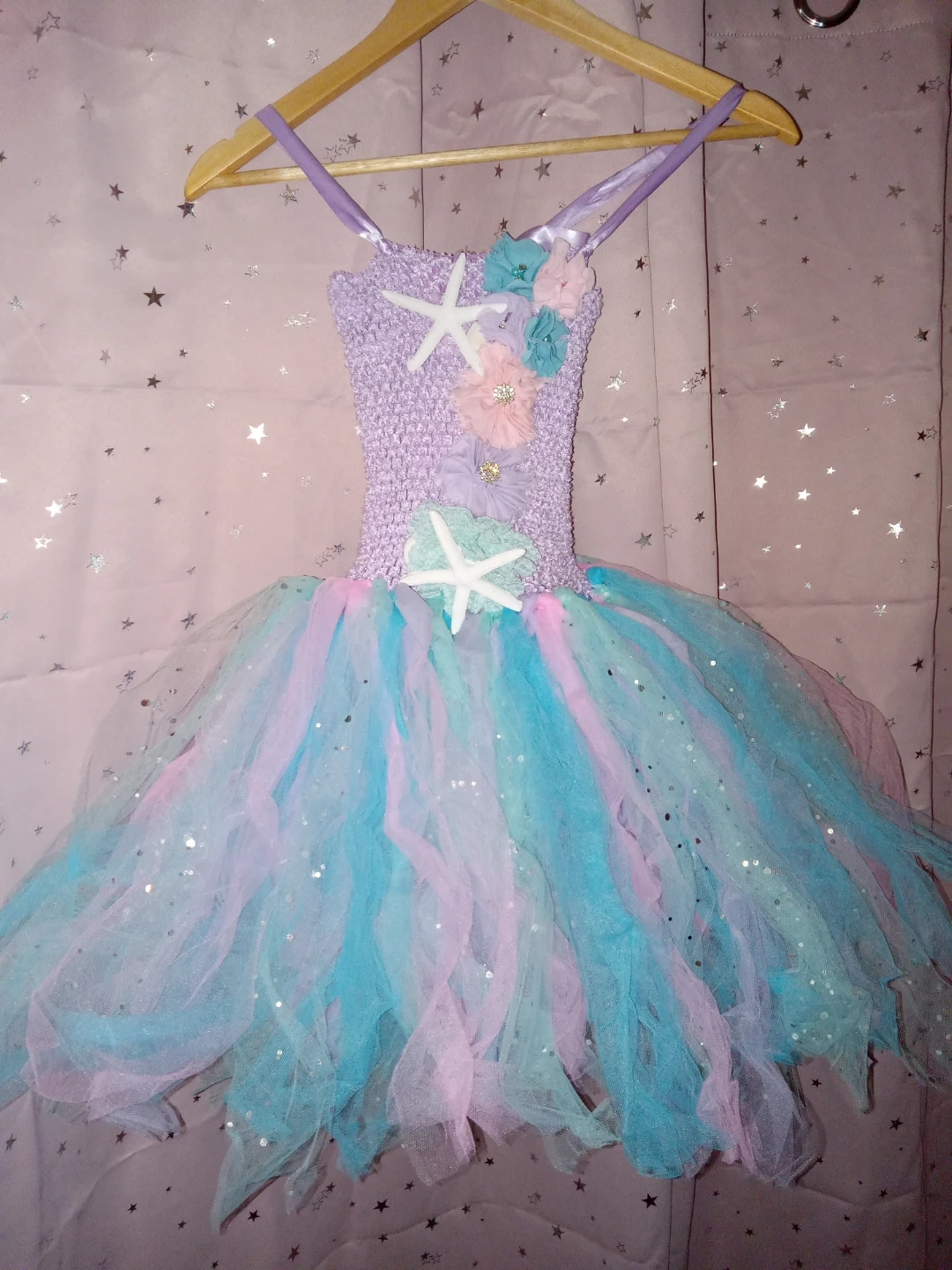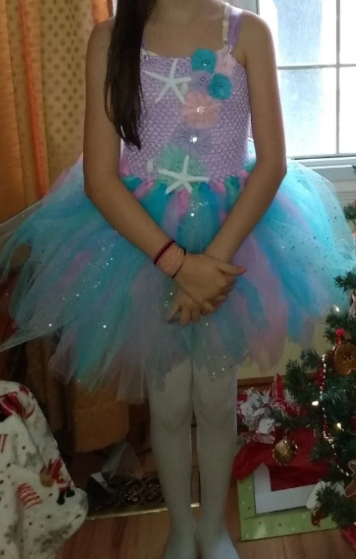 Adorable mermaid tutu dress! The dress features a crocheted bodice with starfish and flower embellishments. The skirt is made of layers of tulle in shades of blue, pink, and purple. Perfect for dress-up or a special occasion! The girl in the photo wearing it is a very skinny 12 year old the dress is size 11/12 but would probably fit any girl from 9 or 10 depending on the size of the child