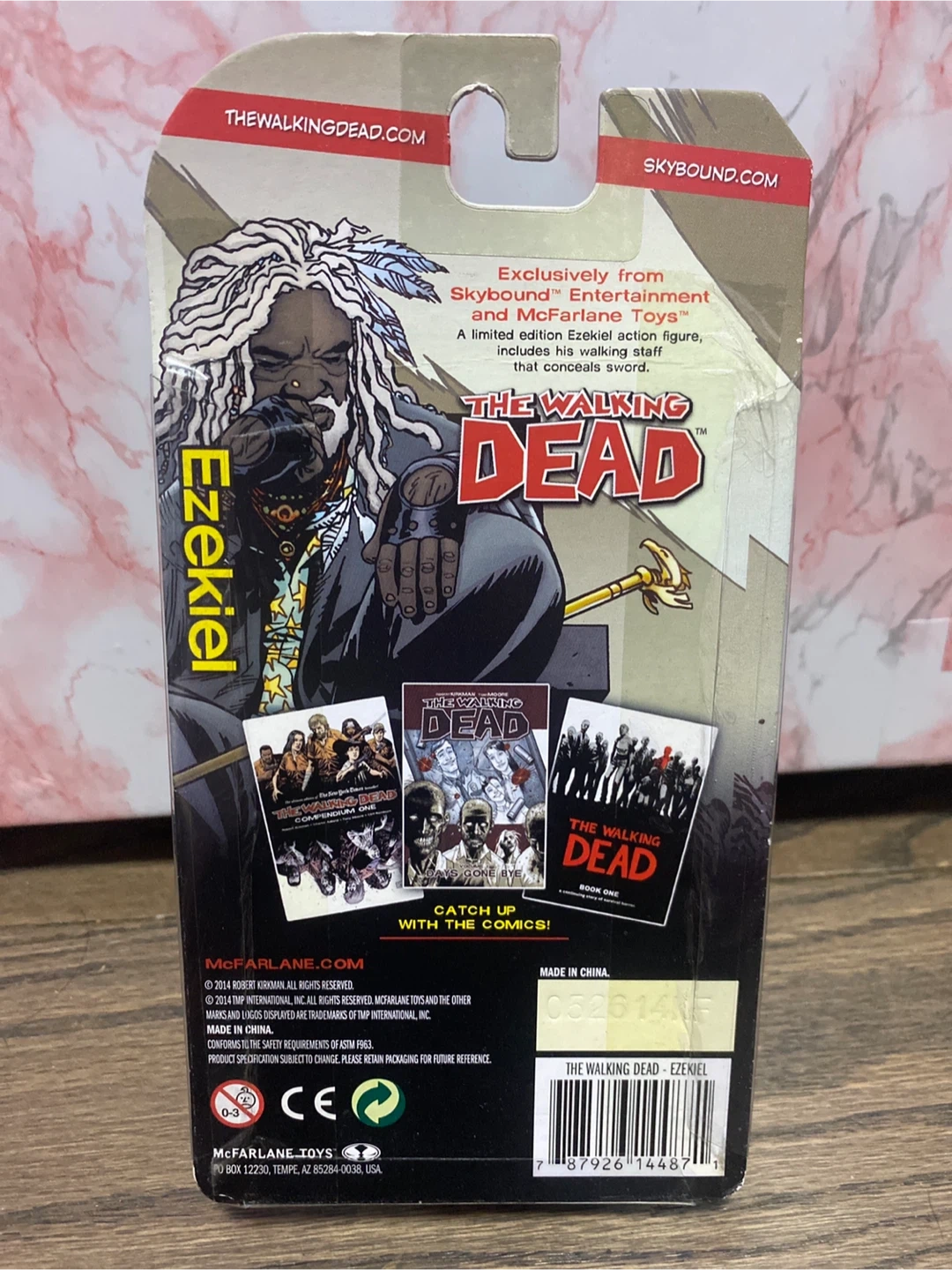 Selling a The Walking Dead Ezekiel action figure by McFarlane Toys. This limited edition figure, exclusively from Skybound Entertainment, includes Ezekiel's walking staff that conceals a sword. It's suitable for ages 13 and up. A great addition to any Walking Dead collection!