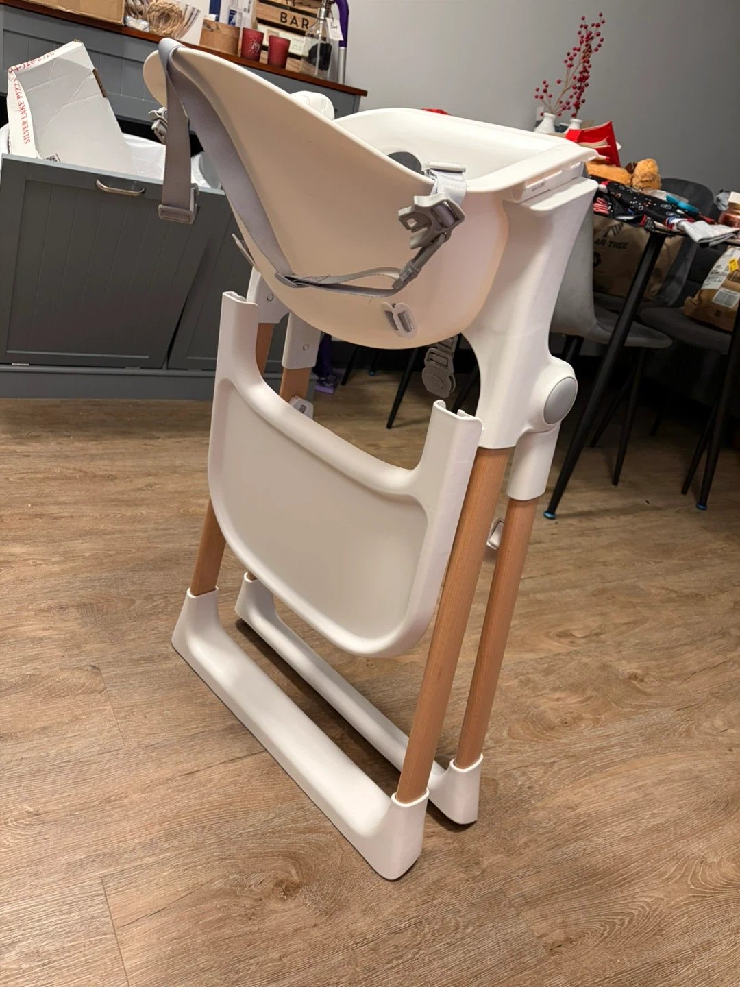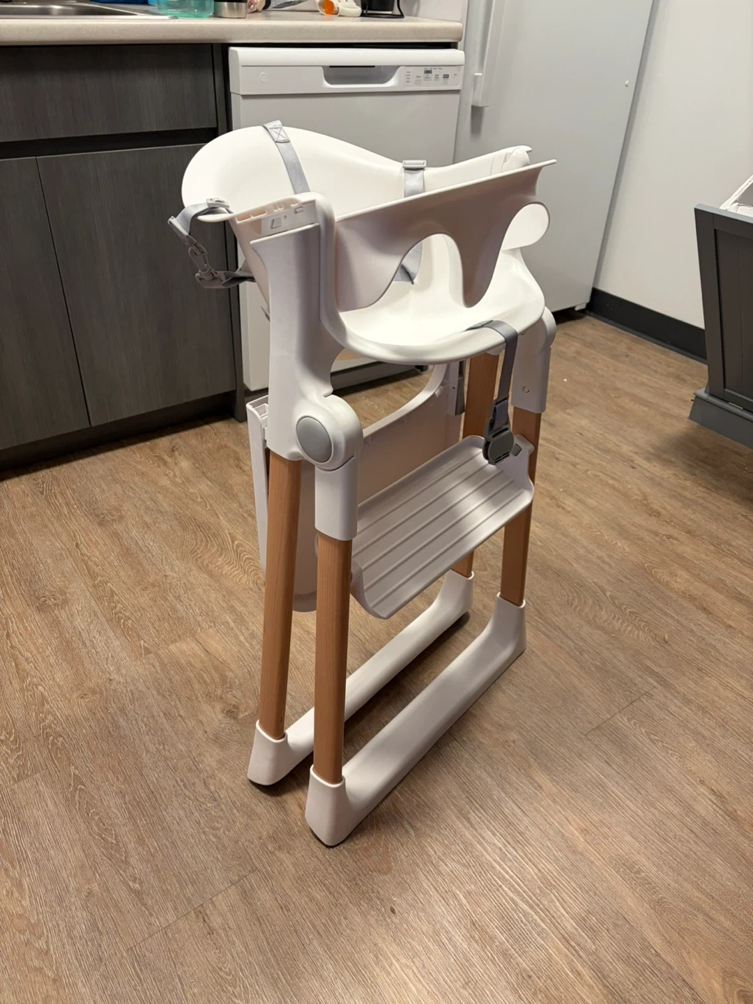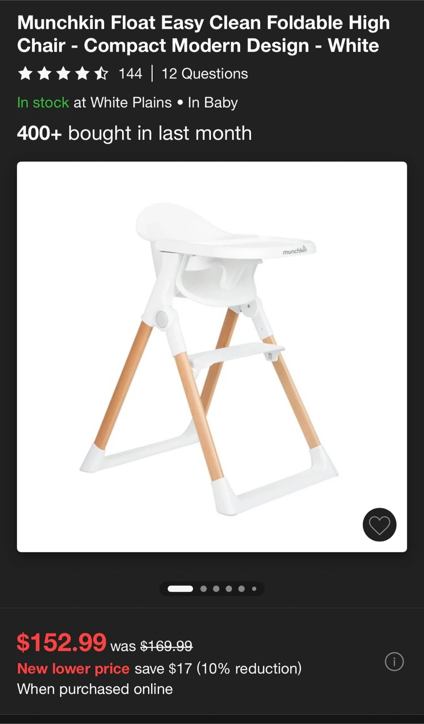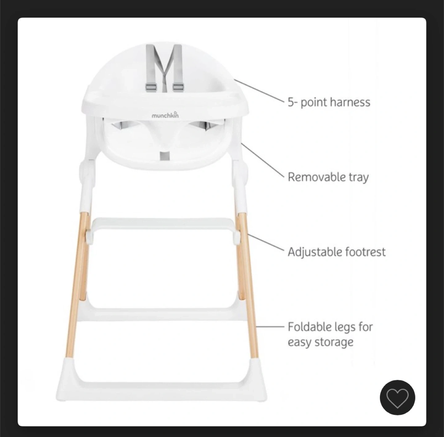 Selling a Munchkin Float Easy Clean Foldable High Chair in white! It features a 5-point harness, removable tray, and adjustable footrest. The legs are foldable for easy storage. Originally bought for $152.99