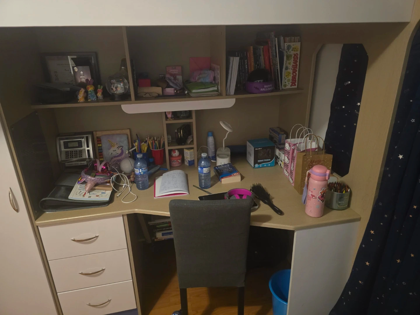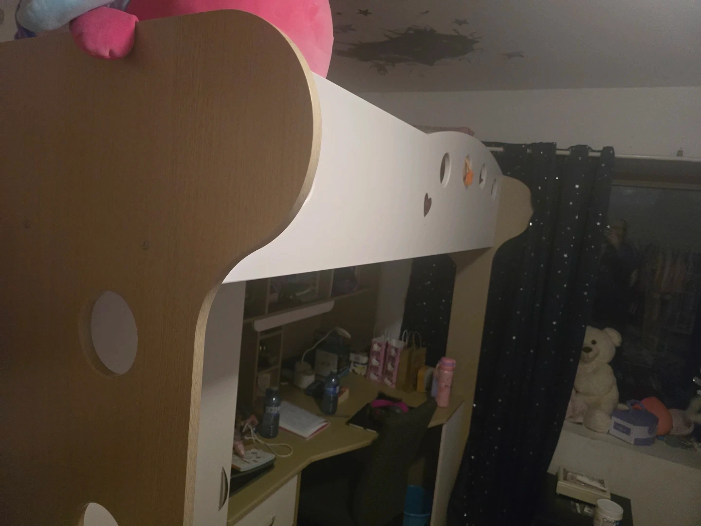 Selling a loft bed for kids! It comes with a built-in desk and storage, perfect for saving space in a smaller room. The bed has stairs with drawers for extra storage. It's in great condition and ready for a new home!