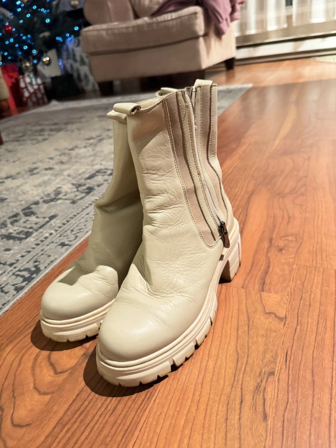 These Artica ankle boots are a stylish addition to any wardrobe! They're made of cream-coloured leather and feature a comfortable, chunky sole. Perfect for adding a bit of edge to your everyday look