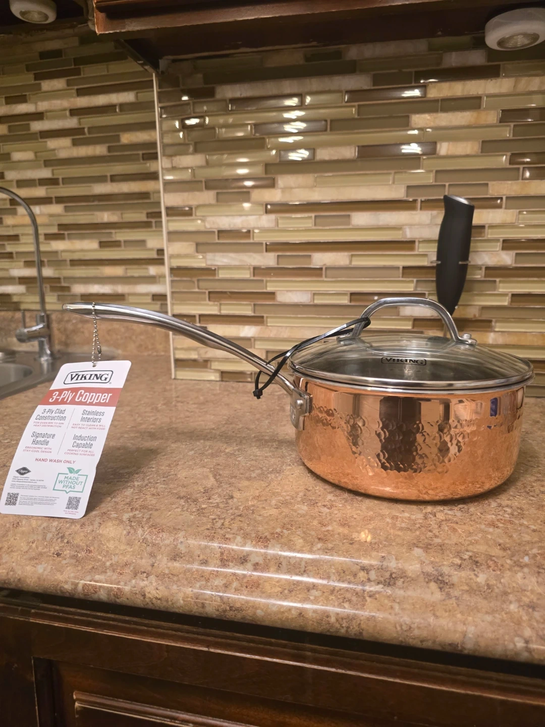 Selling a Viking 3-Ply Copper Saucepan! It has a signature handle and is induction capable. The saucepan is made with PFAS. It also has a stainless steel interior