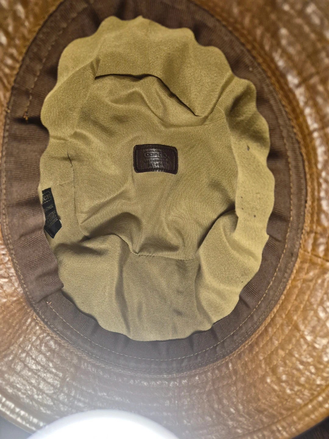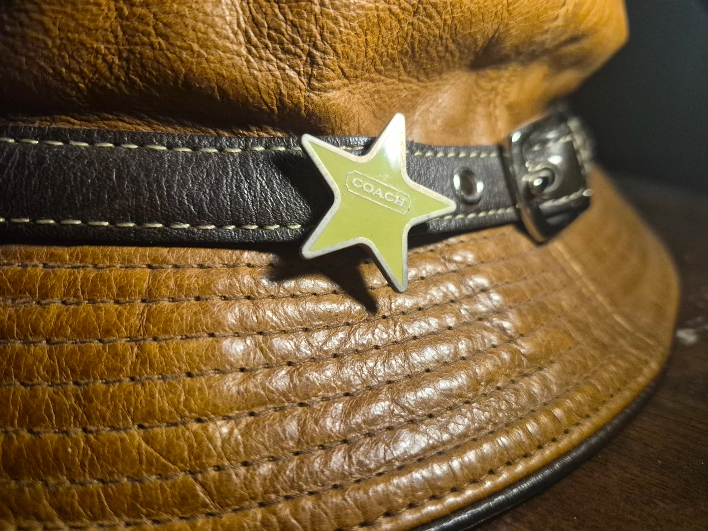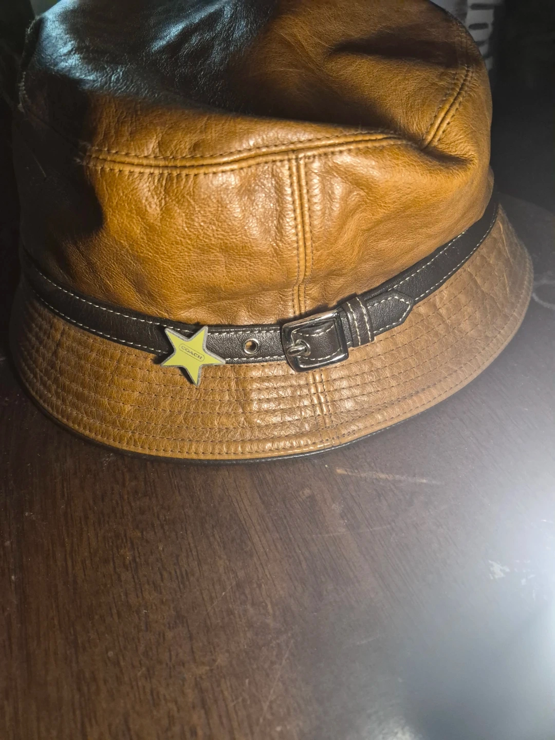 Here's a stylish Coach bucket hat made from 100% leather! It's a size M/L and has a unique design with a star accessory. The lining is 100% polyester. Made in Korea.