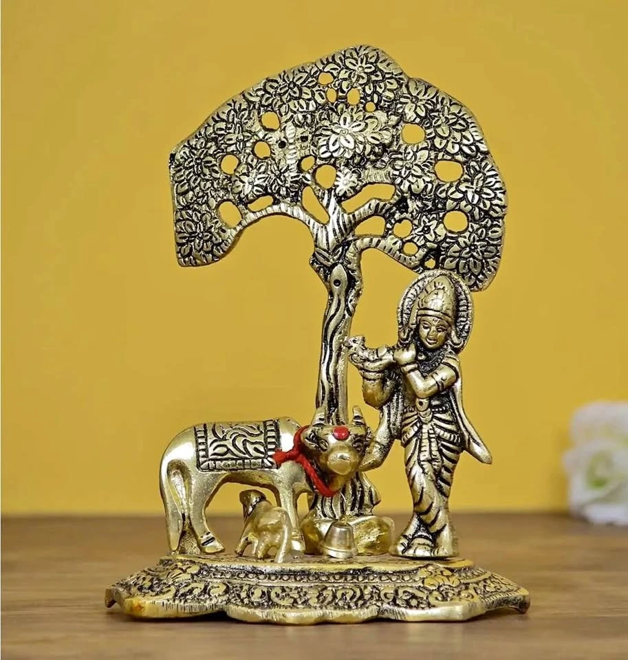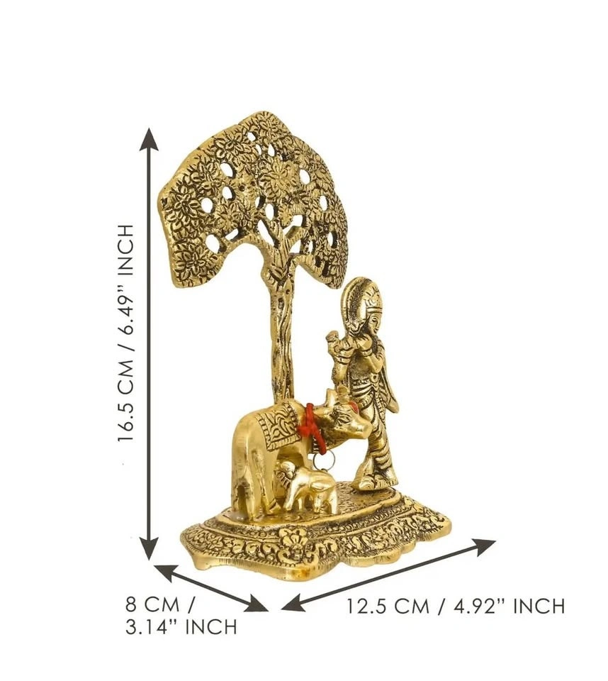 Elevate your space with this stunning, brand-new statue of Lord Krishna with Kamdhenu (the holy cow). This piece features an exquisite antique finish and intricate detailing.