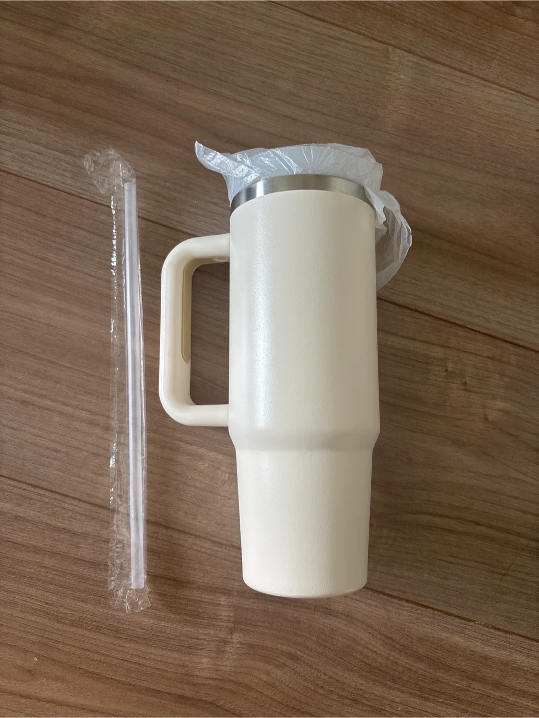Selling a large cream-coloured tumbler! It comes with a convenient handle and a straw, perfect for keeping your drinks cold (or hot!). Great for staying hydrated on the go.