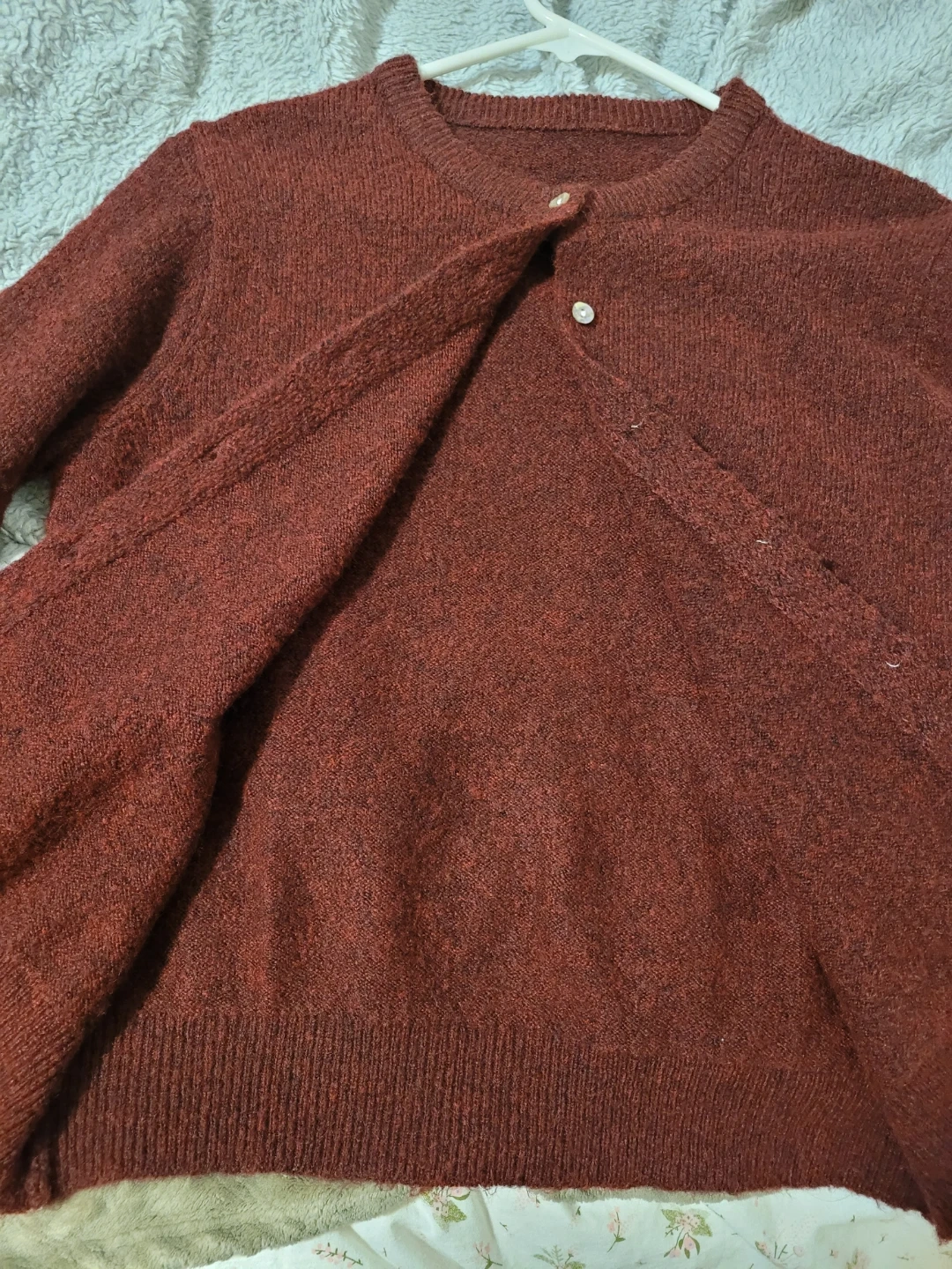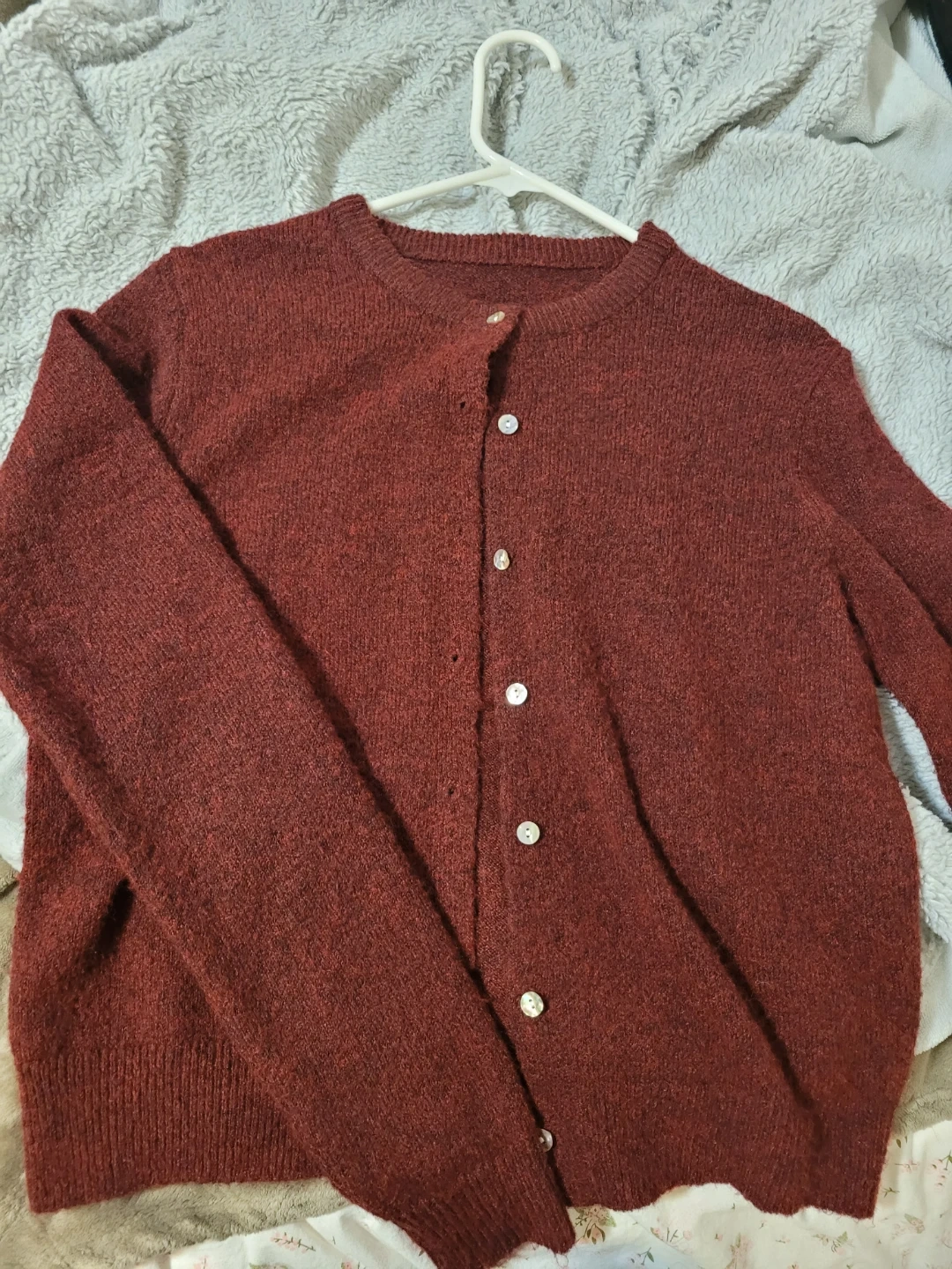 A cozy maroon cardigan in good condition. It has a classic look and is perfect for layering.