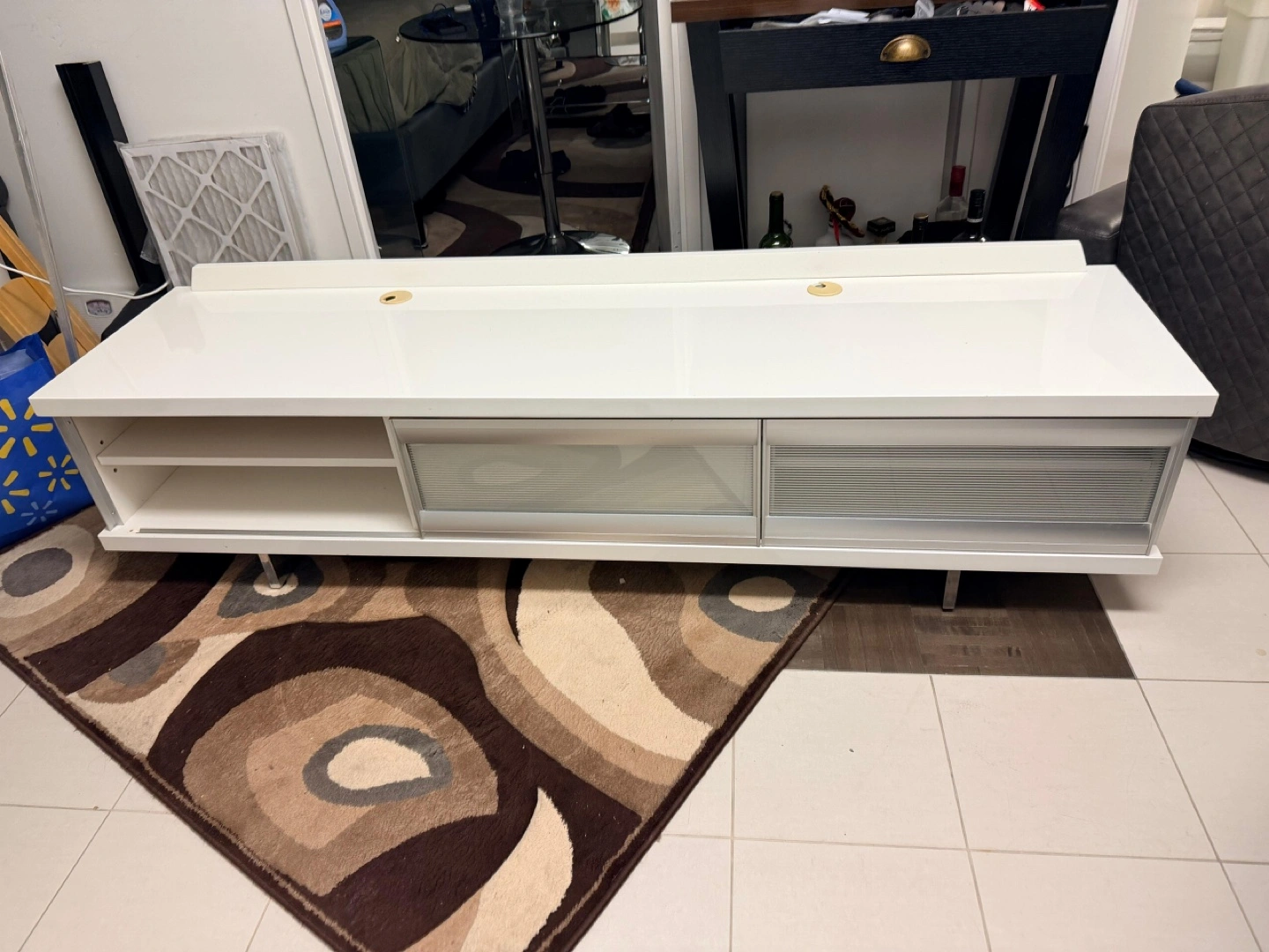 Selling a white TV stand that's in good condition. It features drawers for storage and a sleek design. Perfect for your living room setup!