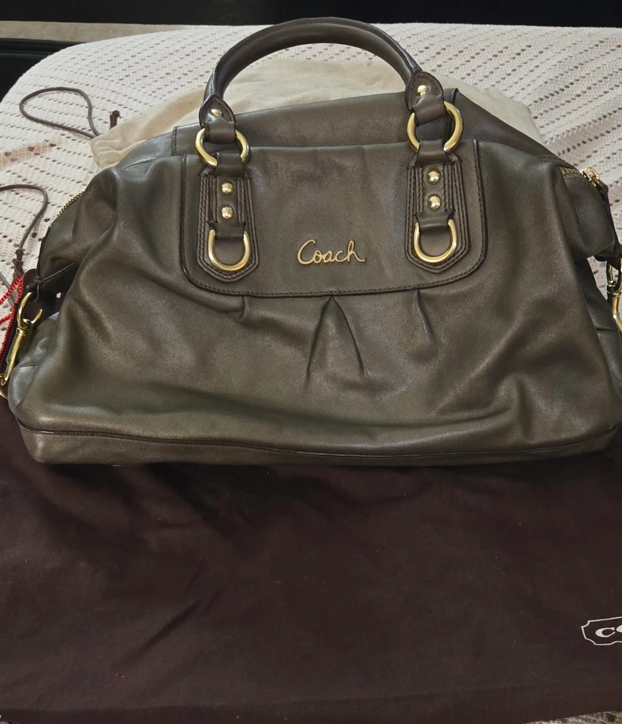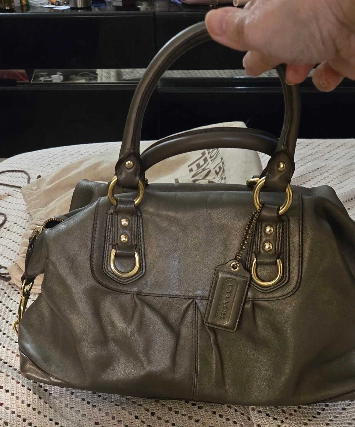 Selling a Coach leather satchel in olive green. It's in good condition and ready for a new owner! The bag features gold-tone hardware and a spacious interior.
