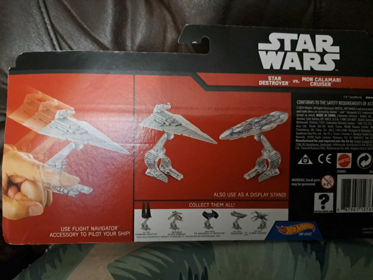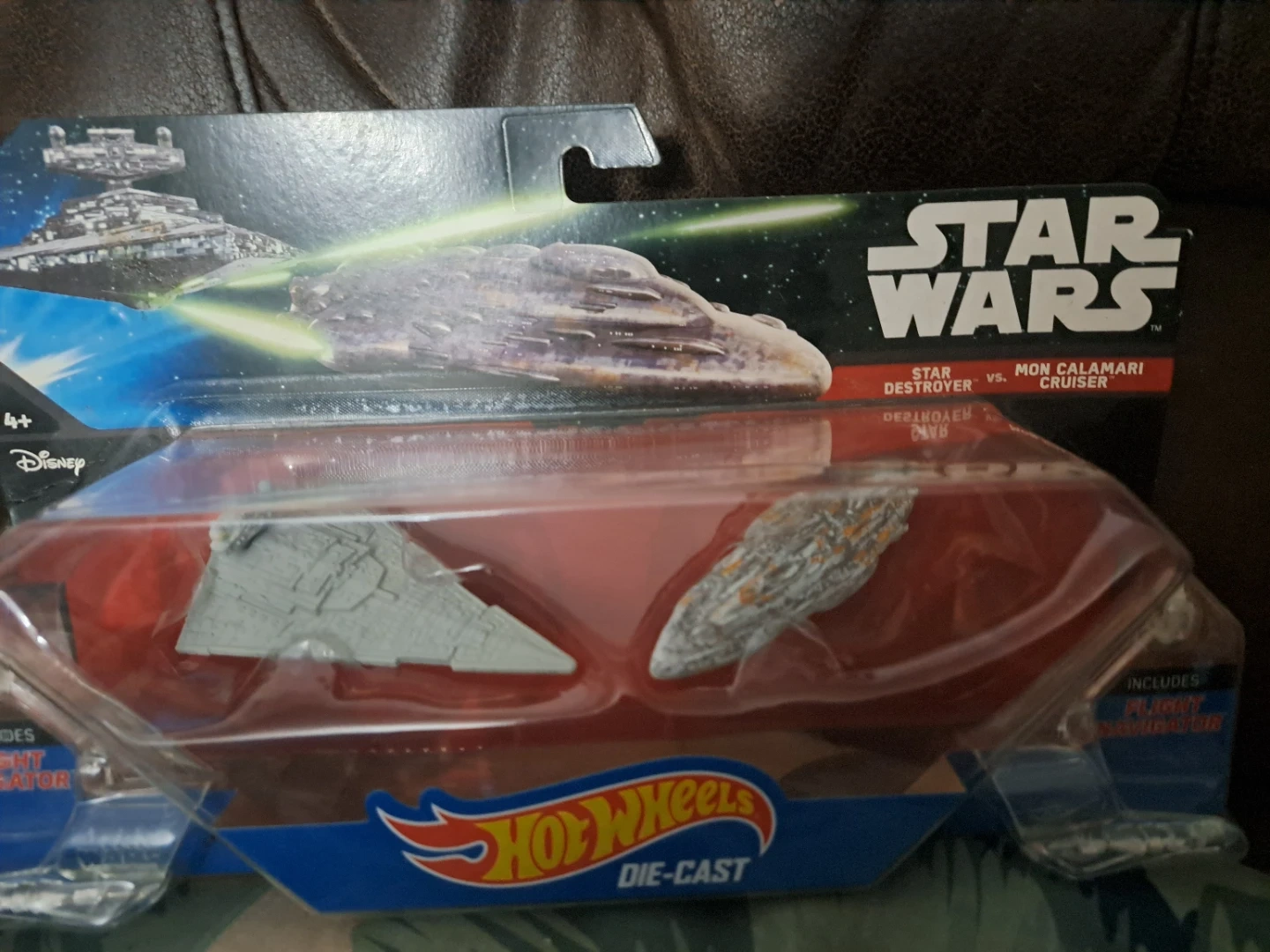 Selling a Hot Wheels die-cast set featuring the Star Wars Star Destroyer versus the Mon Calamari Cruiser! Includes a flight navigator accessory to pilot your ship. Collect them all!