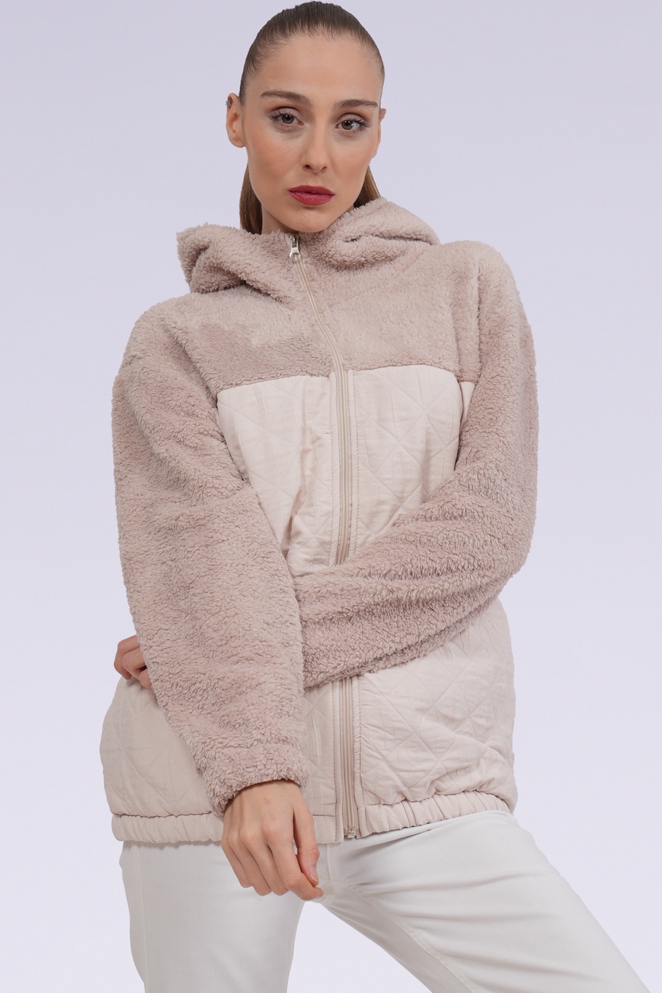 Brand new ! This jacket features a cozy combination of quilted and fleece textures in a neutral beige colour. It has a hood for extra warmth and a zip-up front, perfect for layering on chilly days. I