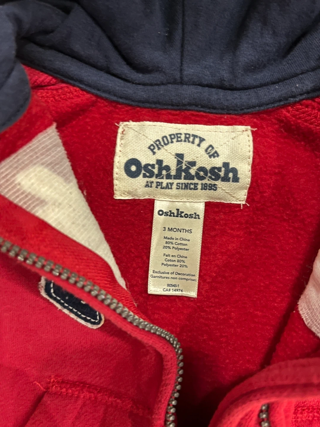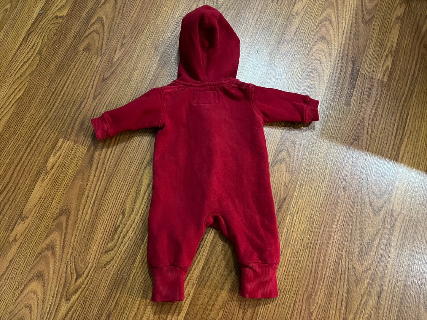 OshKosh B’gosh hooded sleeper-style onesie for baby boys size three months. Red cotton blend with front zip and embroidered logo detail. Footless design with ribbed cuffs.