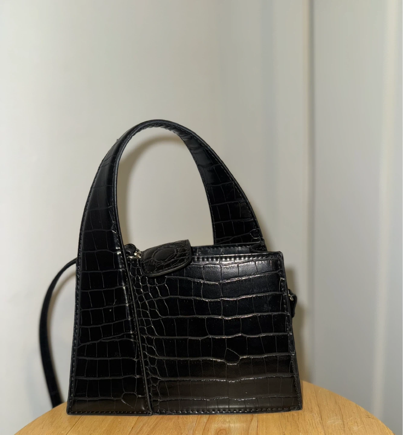 Selling a stylish black handbag with a croc-embossed texture! It's a great size for everyday use and adds a touch of sophistication to any outfit