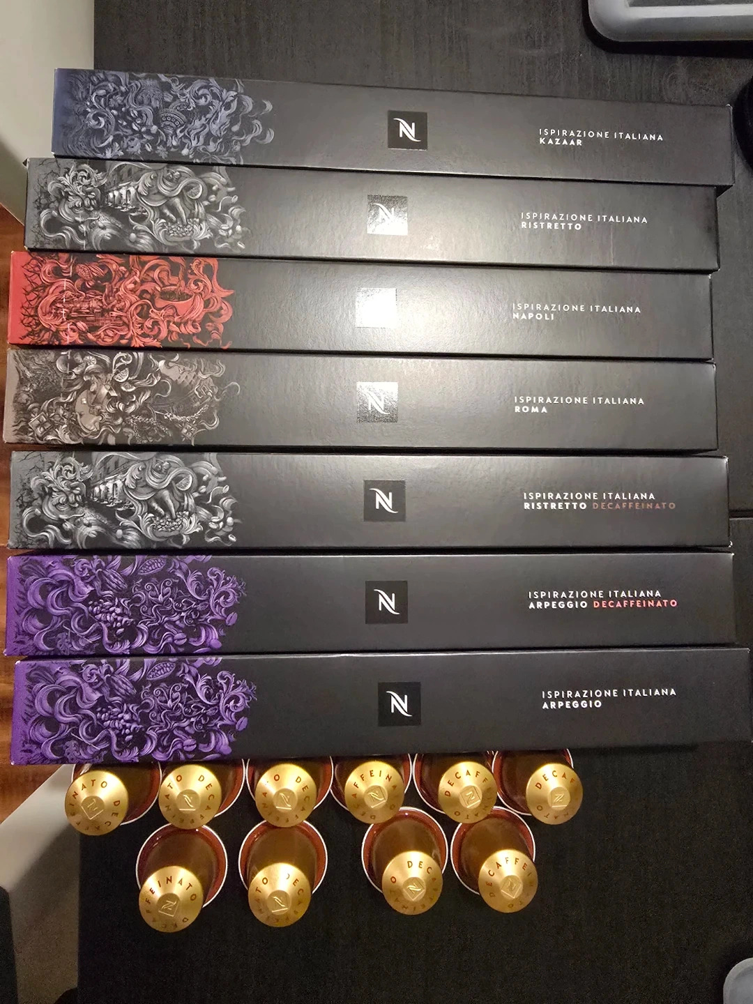 Selling a variety pack of Nespresso capsules! Includes different flavours from the Ispirazione Italiana line: Kazaar, Ristretto, Napoli, Roma, Ristretto Decaffeinato, Arpeggio Decaffeinato, Volluto Decaffeinato, and Arpeggio