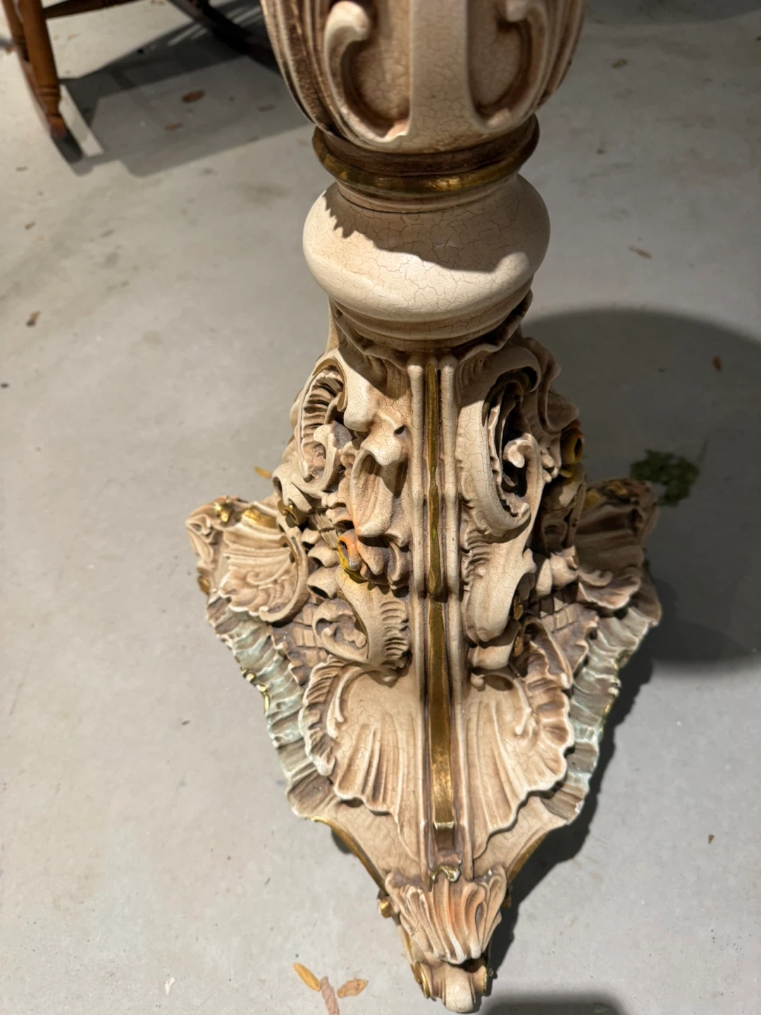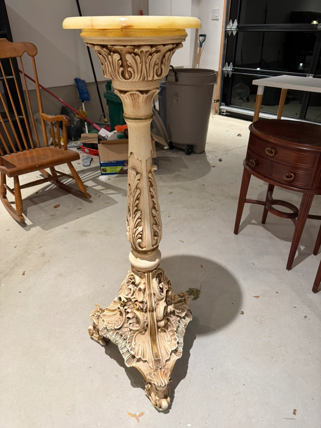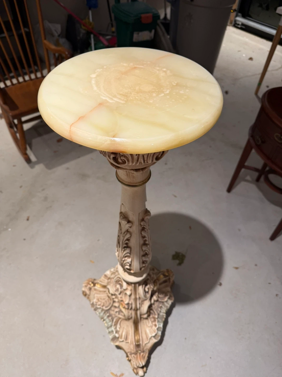 Selling an antique vintage plant stand with a marble top. It stands approximately 45 inches tall and the marble top is about 12 inches in diameter. The base is solid wood with beautiful antique gold accents paint . It's a beautiful piece to display your plants or other decorative items in your home!