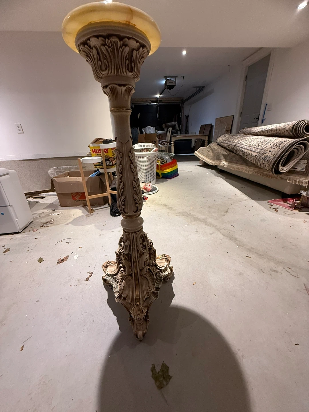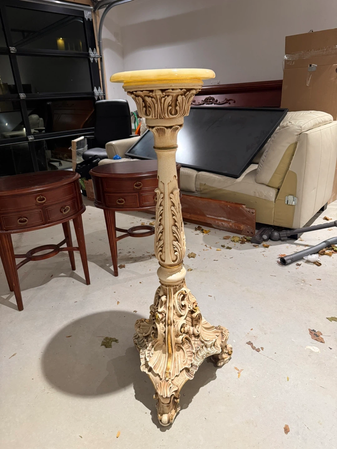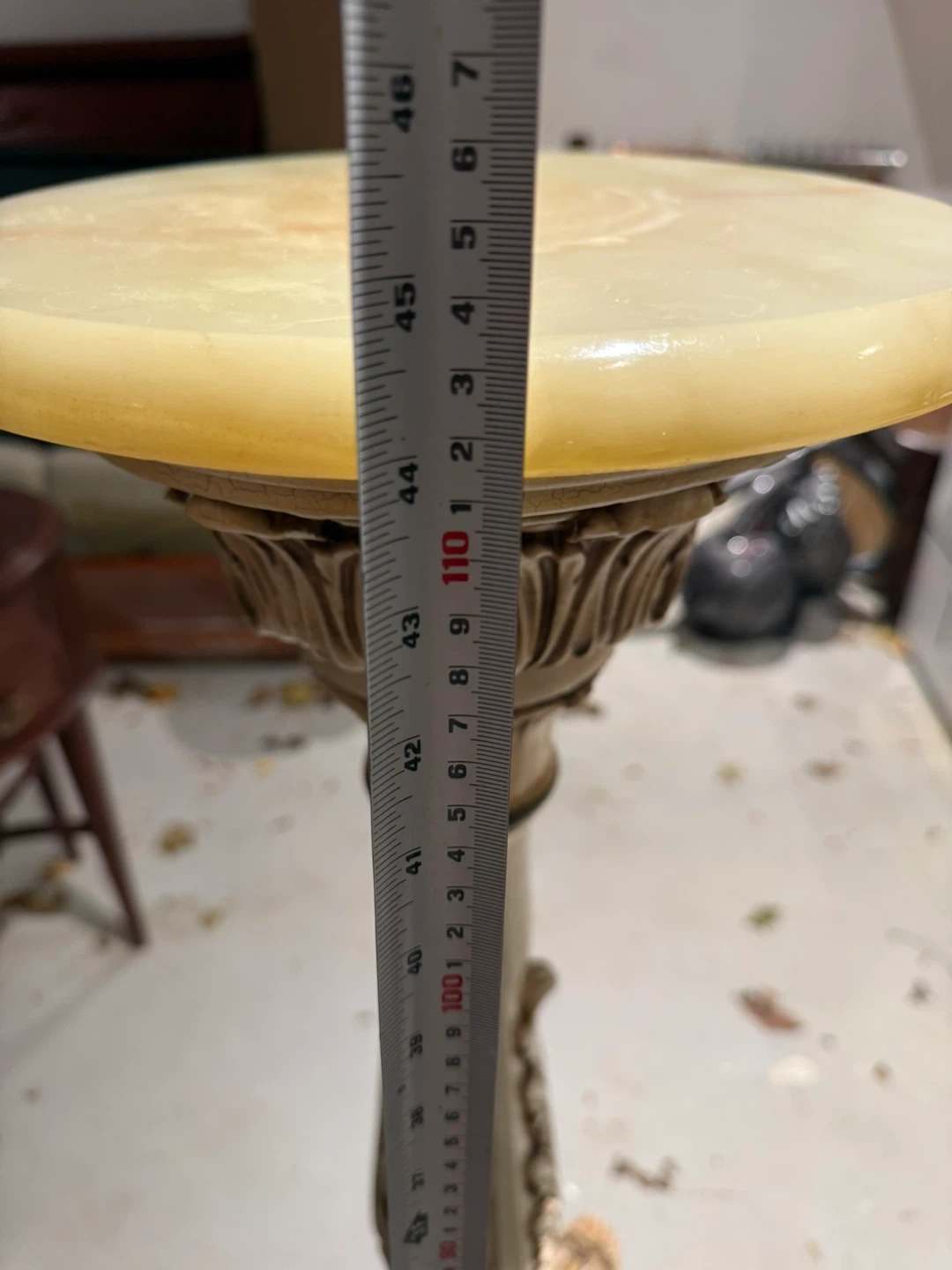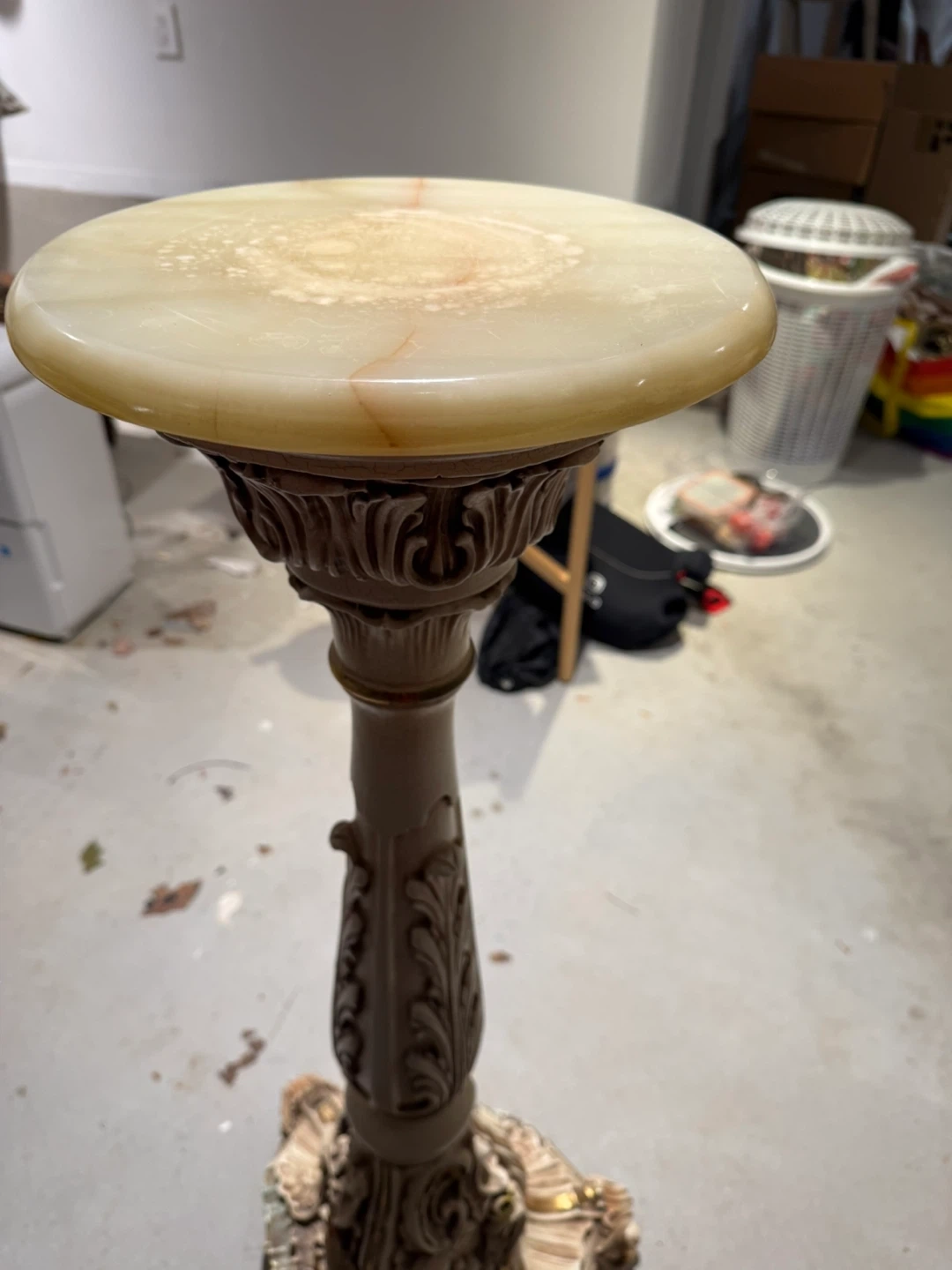 Selling an antique vintage plant stand with a marble top. It stands approximately 45 inches tall and the marble top is about 12 inches in diameter. The base is solid wood with beautiful antique gold accents paint . It's a beautiful piece to display your plants or other decorative items in your home!