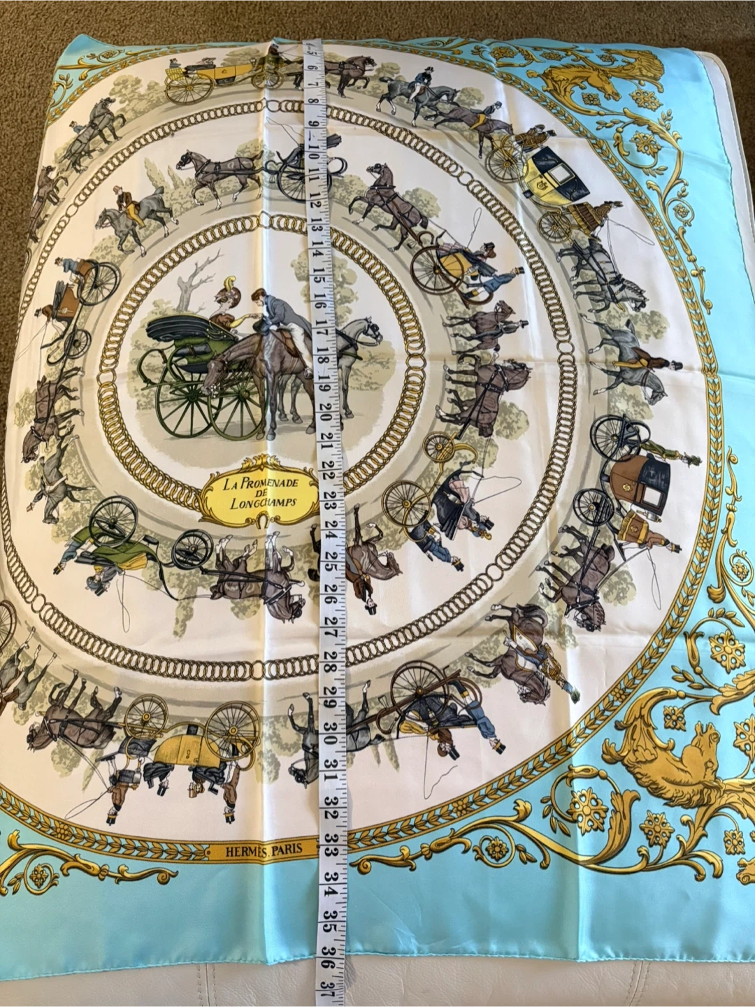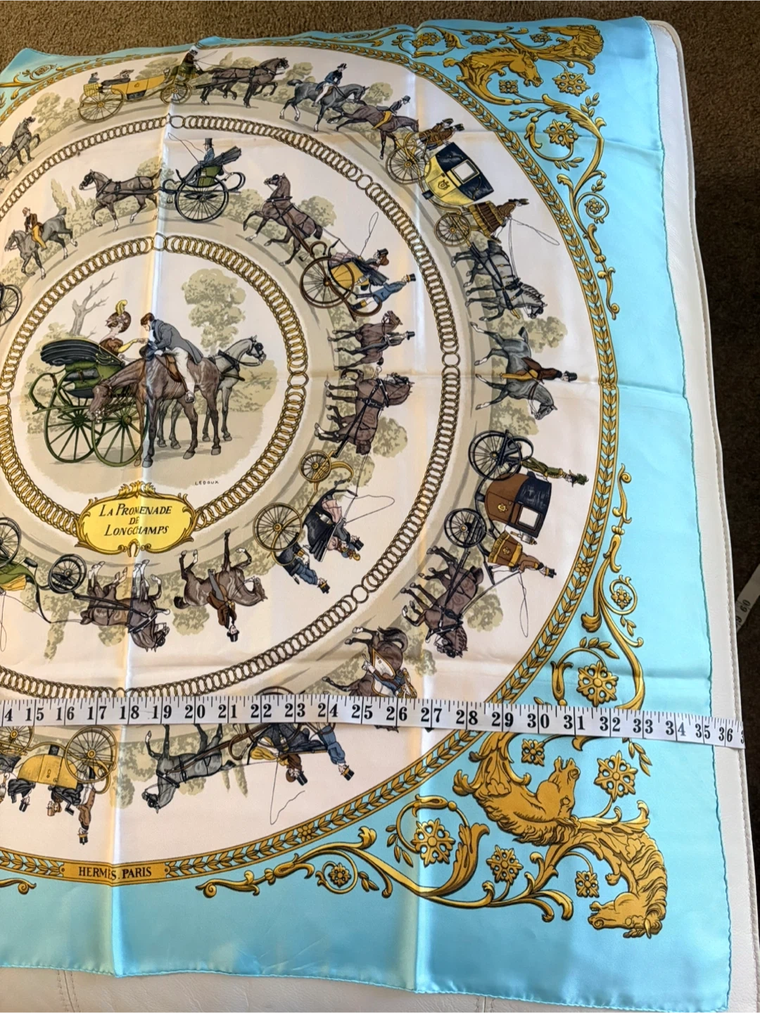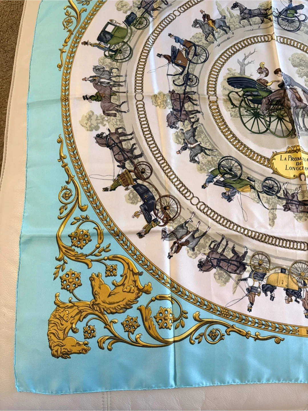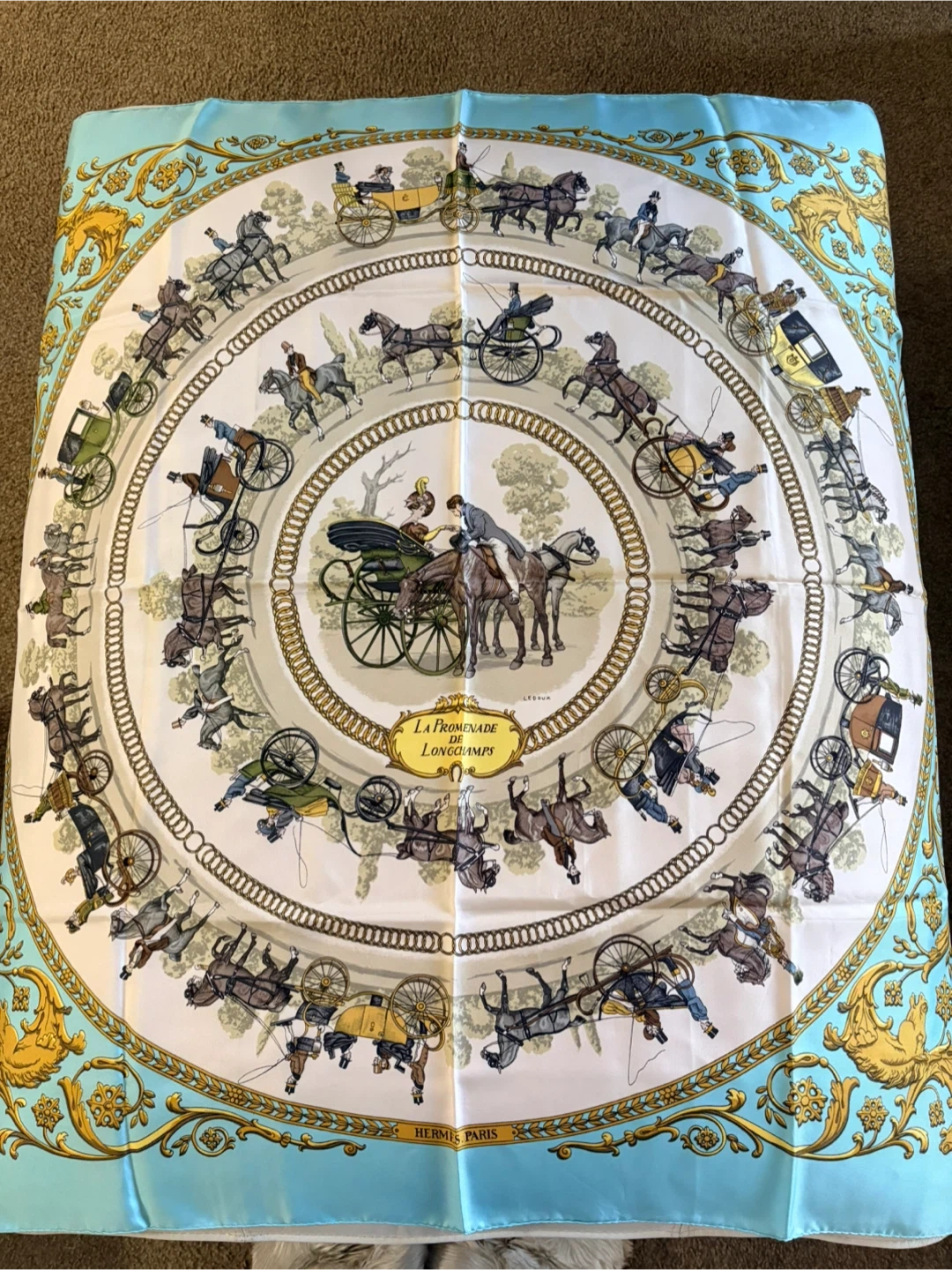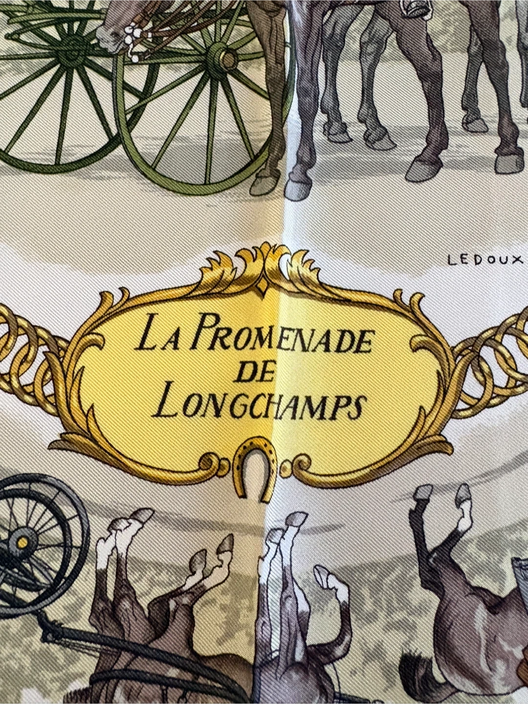 Beautiful Hermès silk scarf featuring the 'La Promenade de Longchamps' design! The scarf has a lovely pattern with horses and carriages, and it's in great condition. A classic piece from Hermès Paris to add to your collection