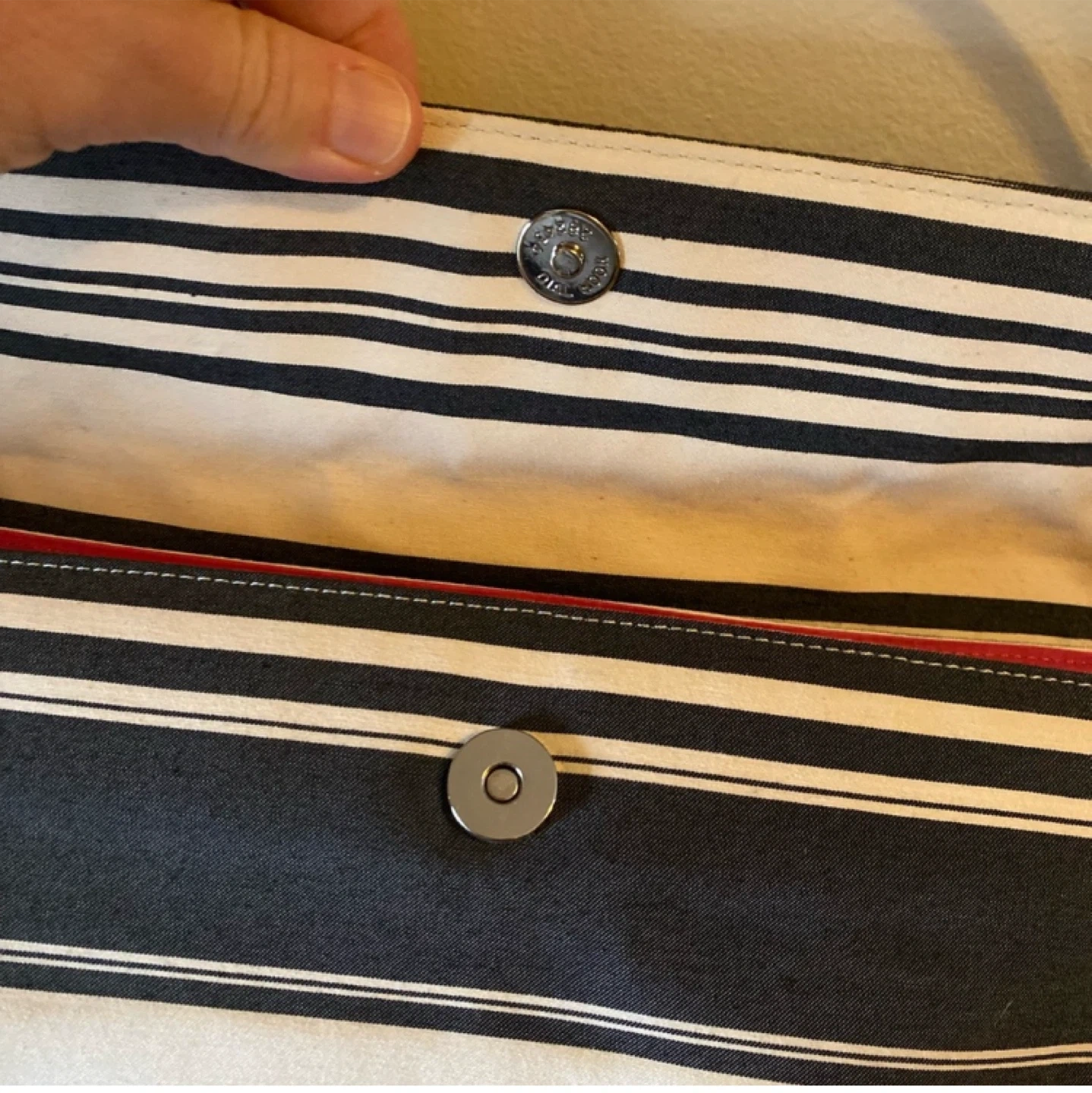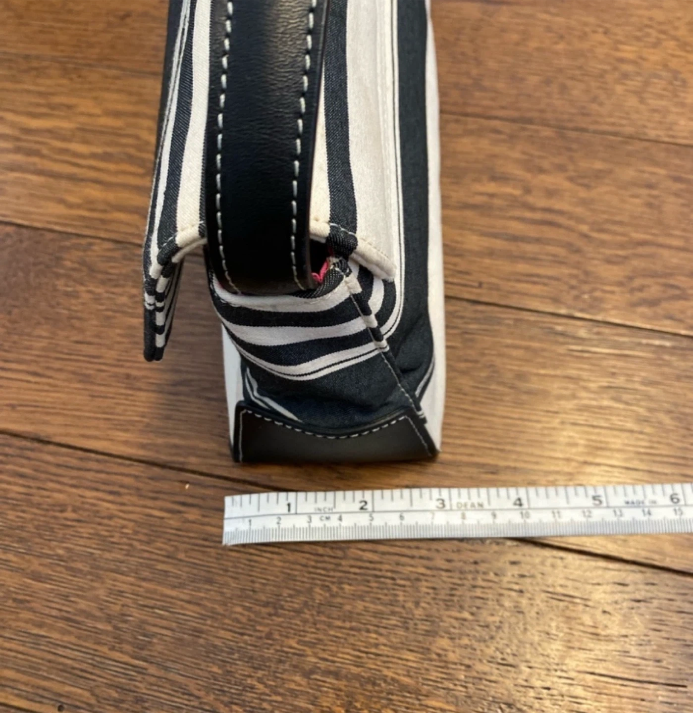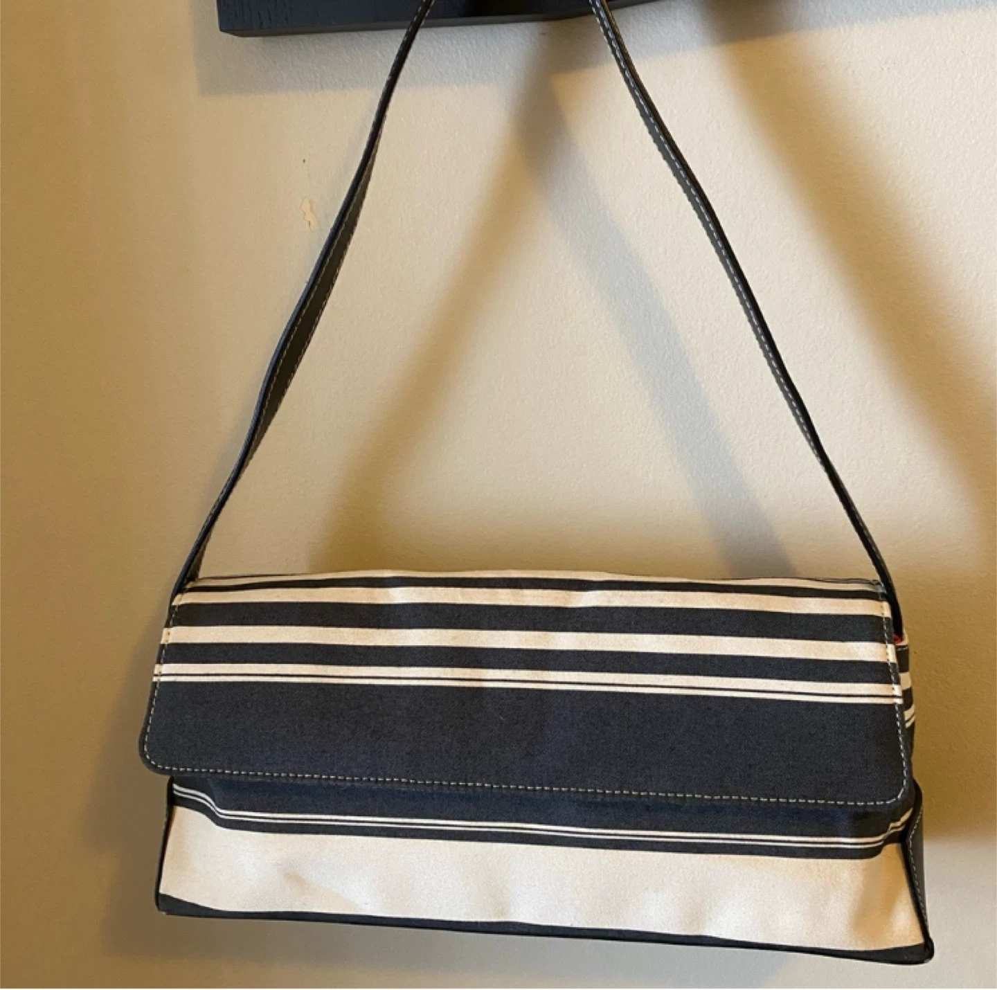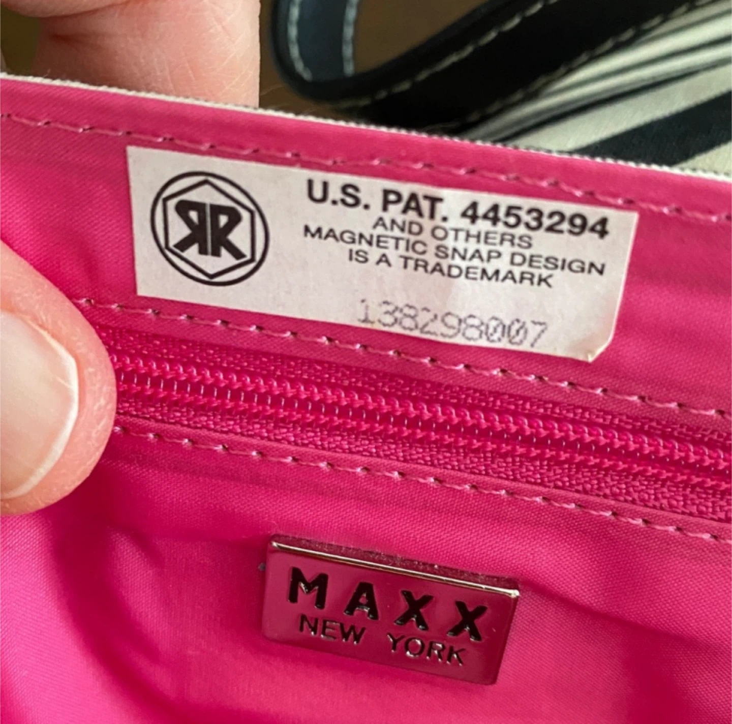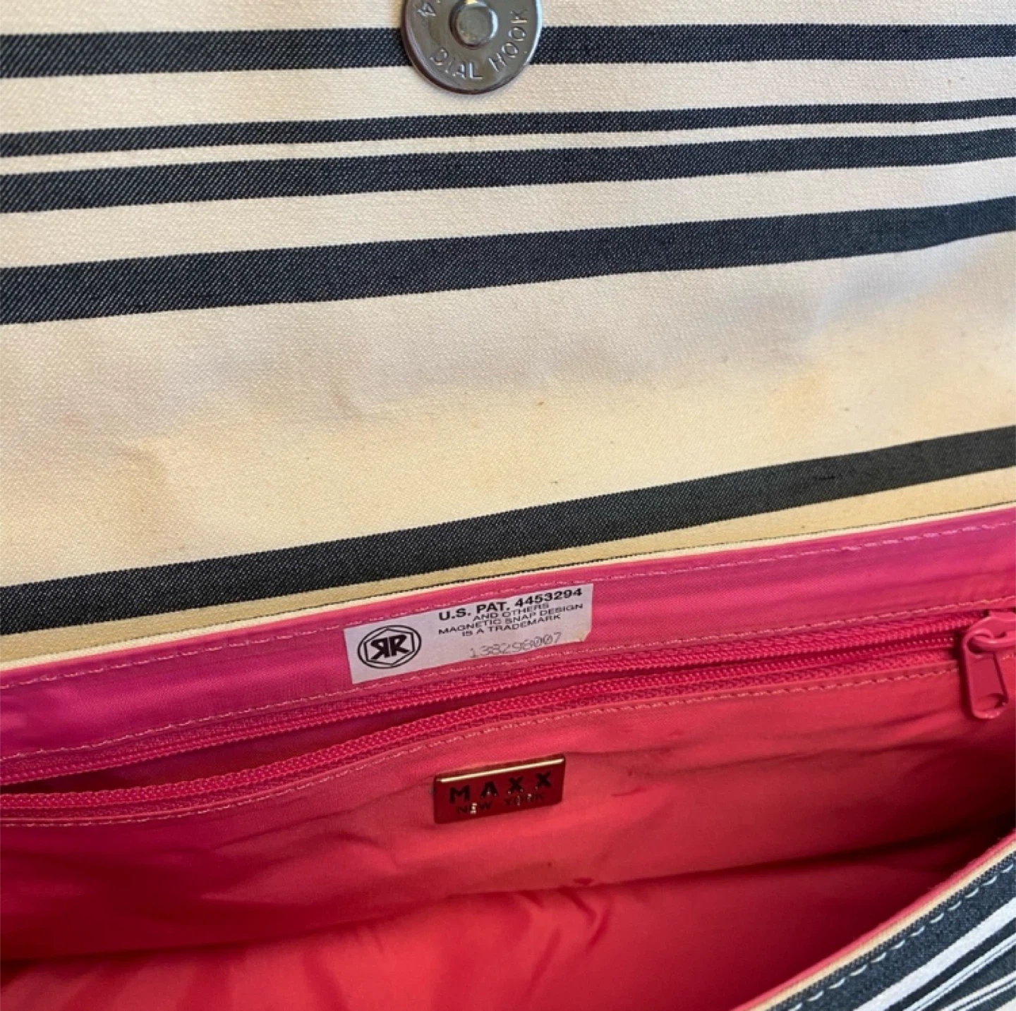 Stylish MAXX New York shoulder bag with a classic striped design! The bag features a magnetic snap design and a vibrant pink interior. Brand new without tags. This black and white purse is brand new without tags.