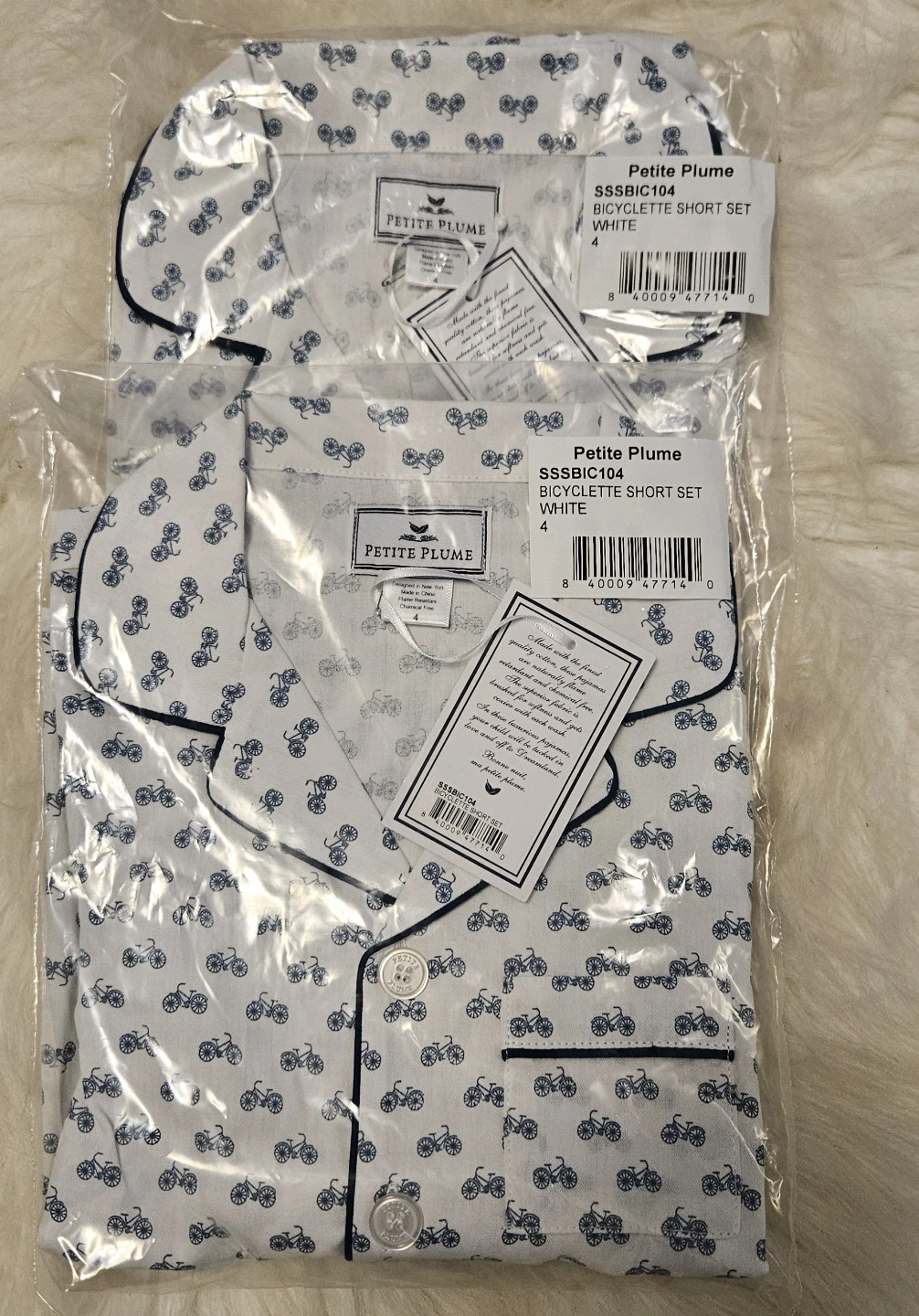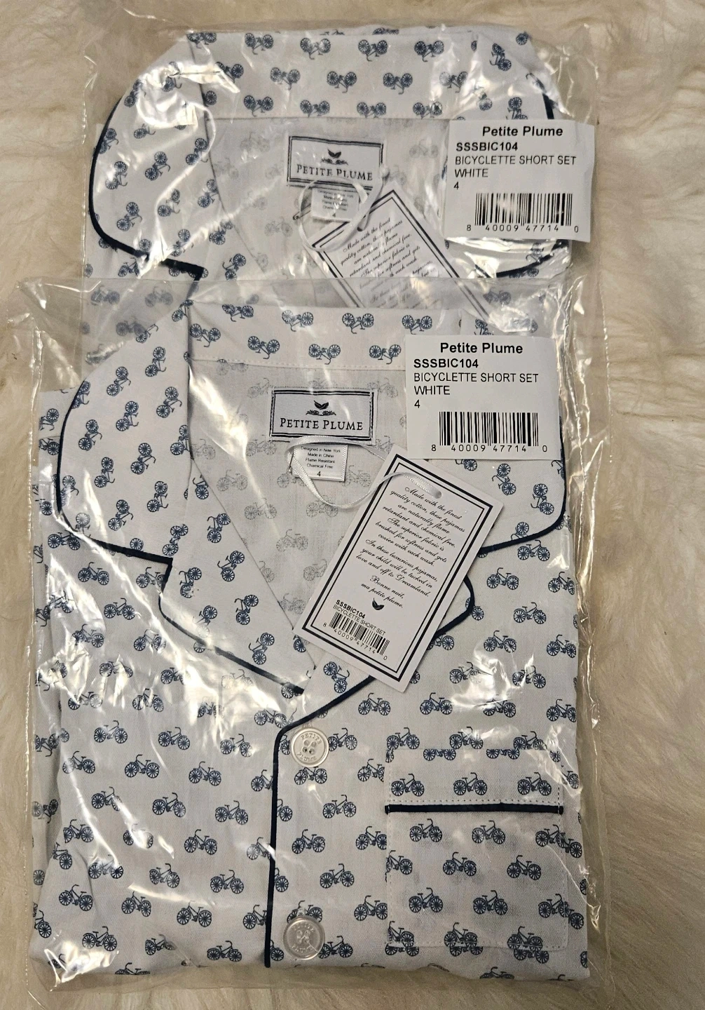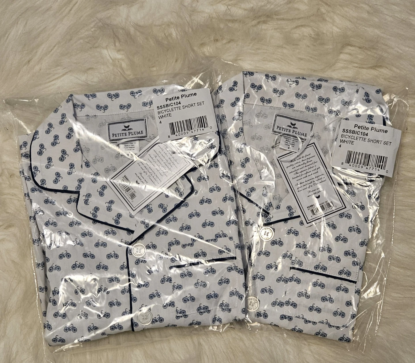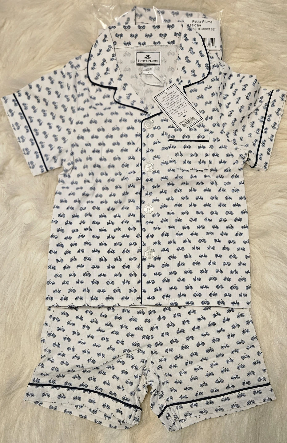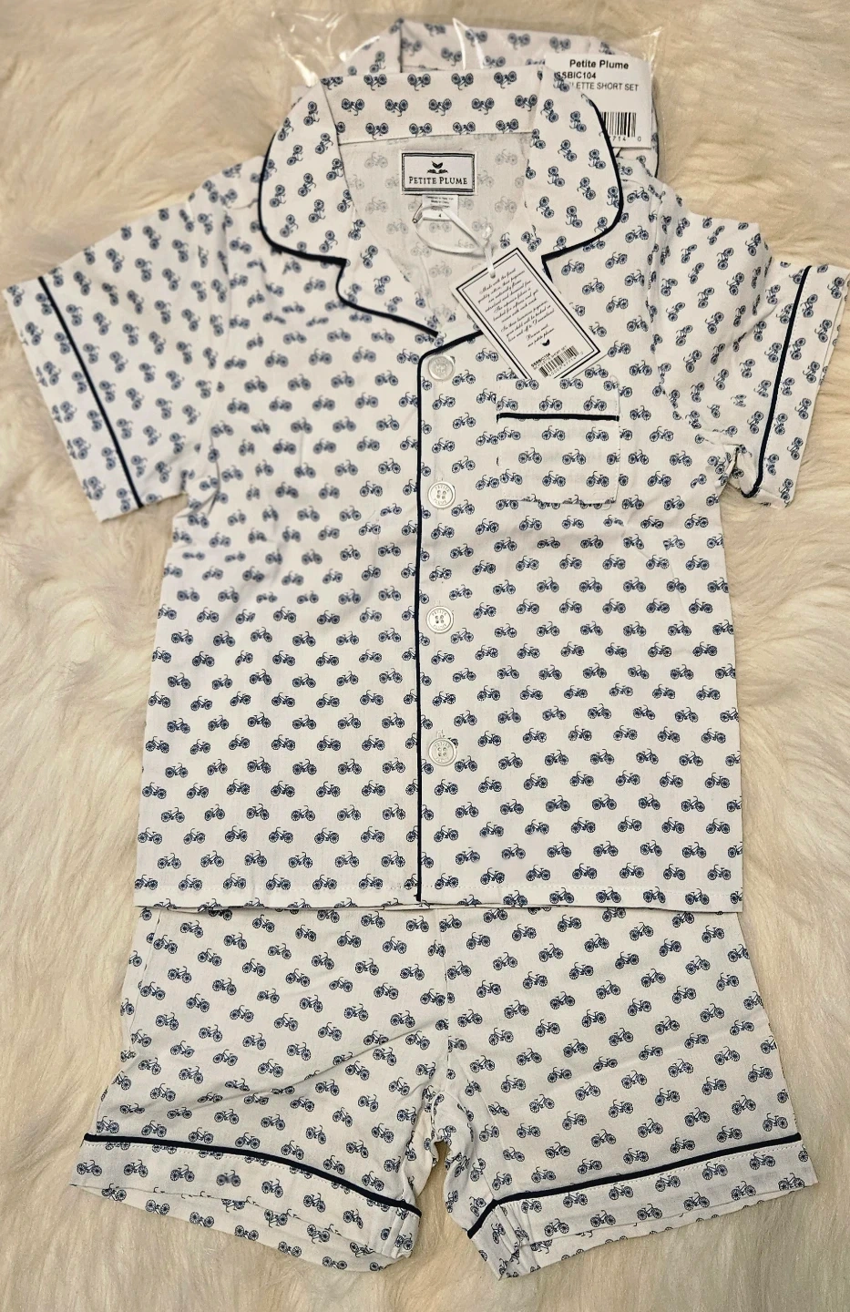 This is a brand new Petite Plume Bicyclette Short Set in size 4. The set is white with a blue bicycle print. It's still in the original packaging with tags attached!