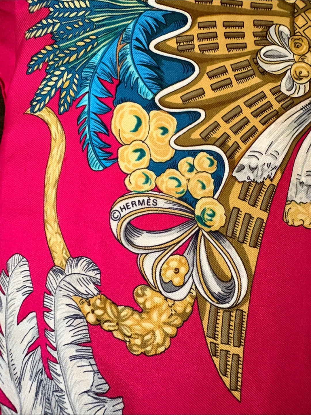 This is a beautiful Hermès silk scarf in a vibrant pink colour. The scarf features an intricate design with various colours and patterns. It's in great condition and ready to add a touch of elegance to any outfit. No box